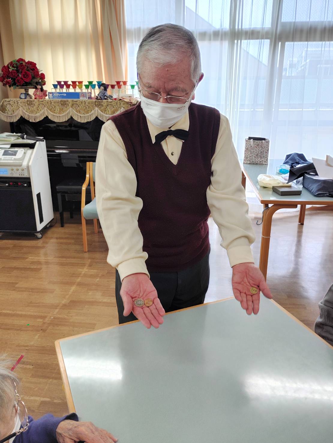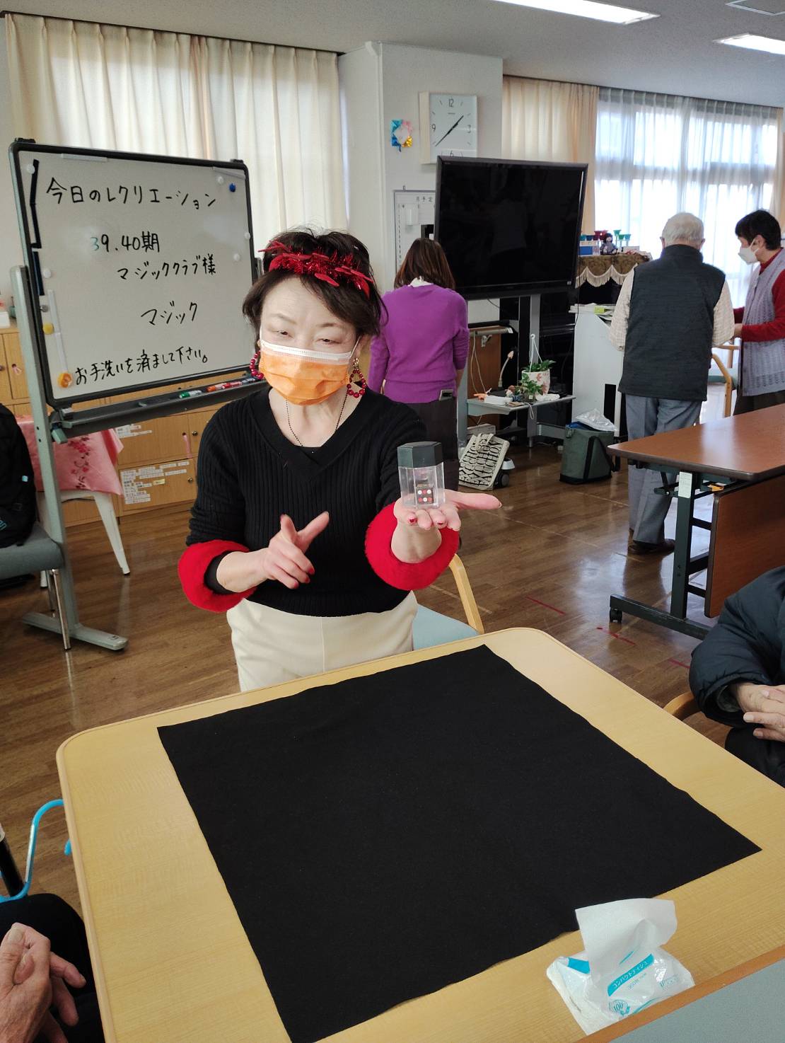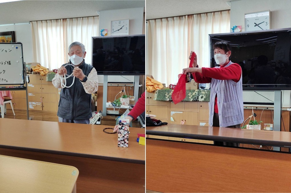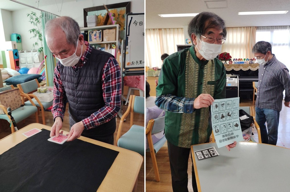 千種デイサービスセンターで恒例のマジック披露をしました。今回、39期生6名、40期生5名、計11名で訪問して、テーブルマジックと演台でのマジックを披露しました。今回は40期生の2名の方が初参加でした。演技を披露する予定だった先輩が急遽病気で来られなくなったので、先輩の分まで演技をする必要になっていました。演技の時間になると各自が授業で習った技や、なかには自分で作成した道具を使ったマジックを熱心に披露していき、入所者は不思議がって楽しんでおられたと思います。元気な来所者からは演技が上手だったとお褒めの言葉をいただきました。クラブ員としては非常に励みになる言葉でした。なお今回は39期生がリードする最後の訪問で次回からは40期生がリードして訪問することになります。