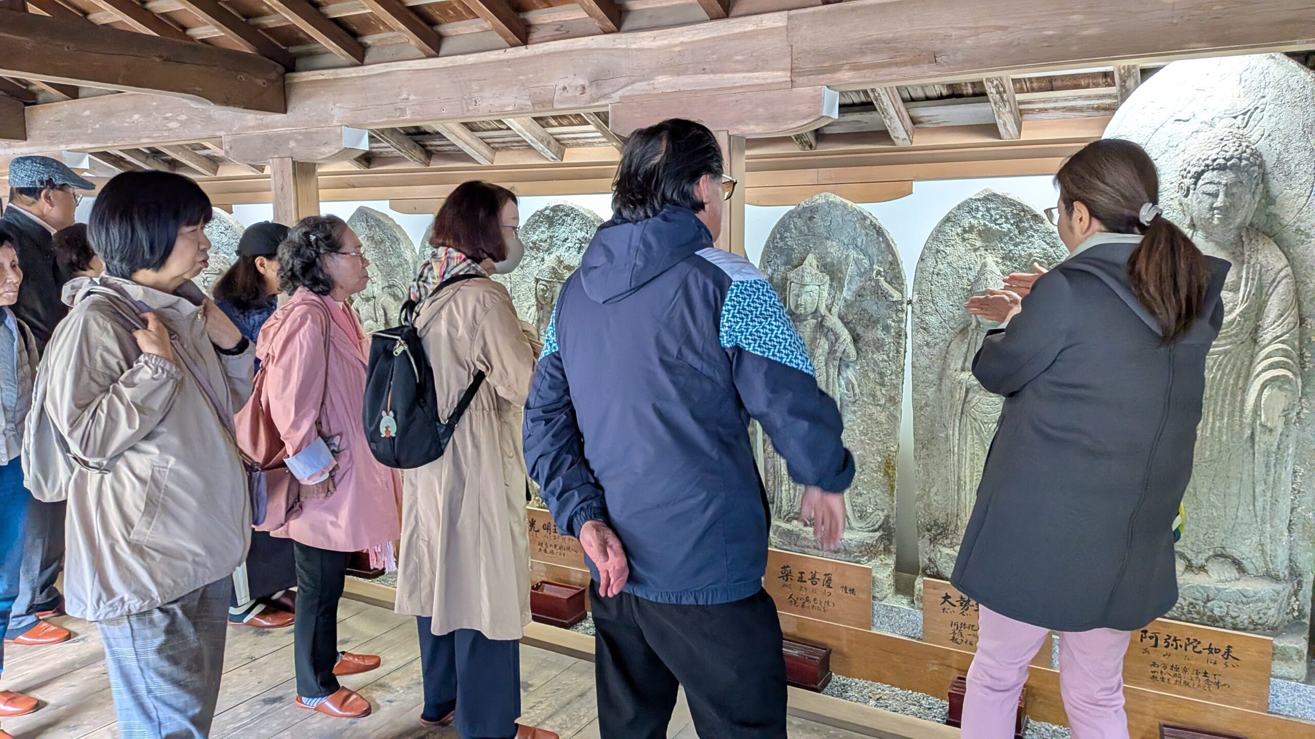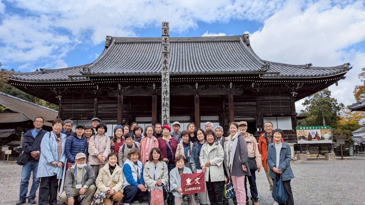 重要文化財宝庫の三井寺を後にし、一路西教寺へと向かいます。沢山の情報を耳にし、目にしながら歩き廻り、お腹も空いてきました。総門前で写真を撮り、行く先は「菊御前」が待っている食堂へ昼食後、本堂前にて集合写真を撮りその後お寺のお坊さんによる拝観案内が鐘楼から始まり、本堂で西教寺の歴史の一端を聞き、その後数々の文化財の説明と内容の濃い拝観ができました。西教寺は明智光秀との関りが深く貴重な文化財もあり大本坊庭園は比叡山と西教寺との位置関係や琵琶湖を模した池などもありとても見応えがありました。屋根瓦には身代わりの手白猿の猿瓦や笏谷石(しゃくだにいし)の阿弥陀二十五菩薩石仏なども目を見張りました。