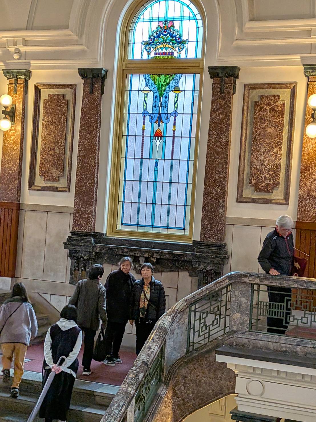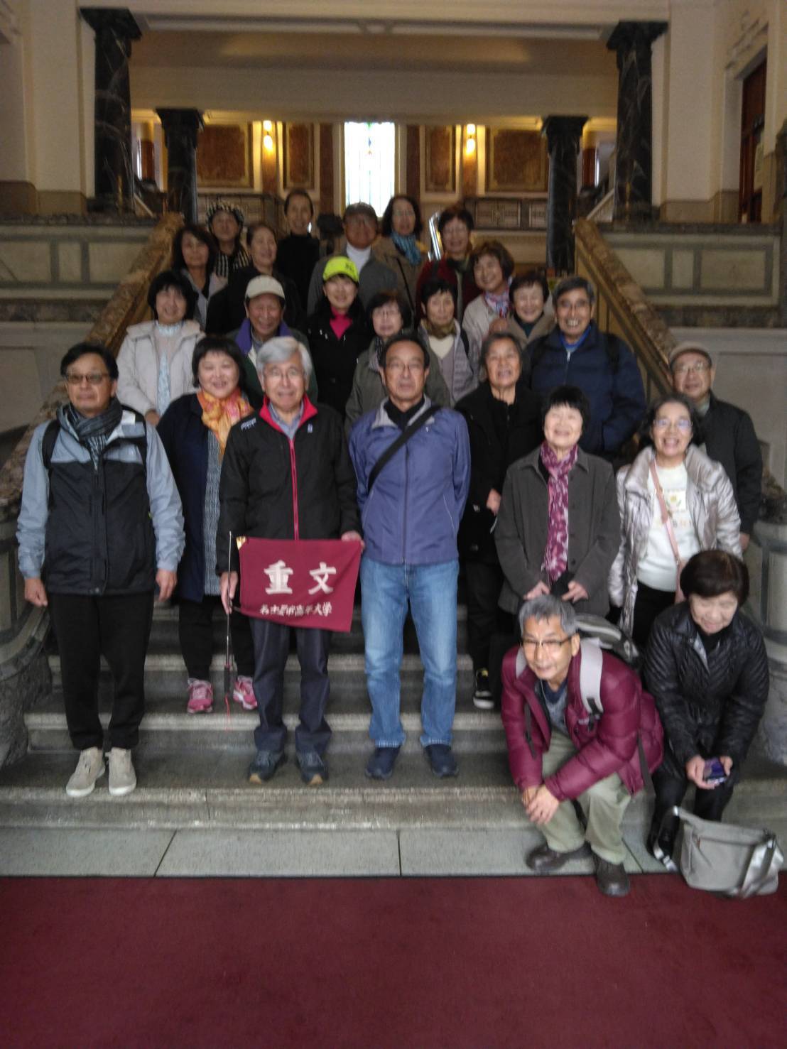 次は雨を避け、行き先を変更した多治見修道院、大聖堂では、フレスコ画、キリストの生涯を描いた壁画、ステンドグラスに魅了されました。昼食後、これもまた雨対策で名古屋市市政博物館の見学。現存する最古の控訴院建築で、ネオ・バロックを基調とし荘厳で華やかな外観、ステンドグラスや中央階段にも感銘を受けました。NHKドラマ「虎に翼」でよく放映された中央階段で集合写真パチリ。
