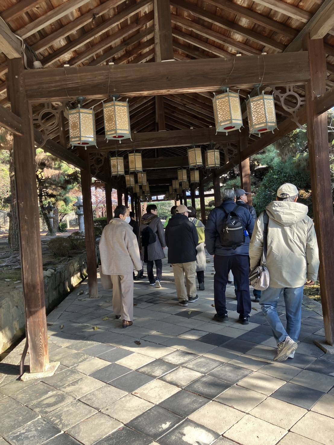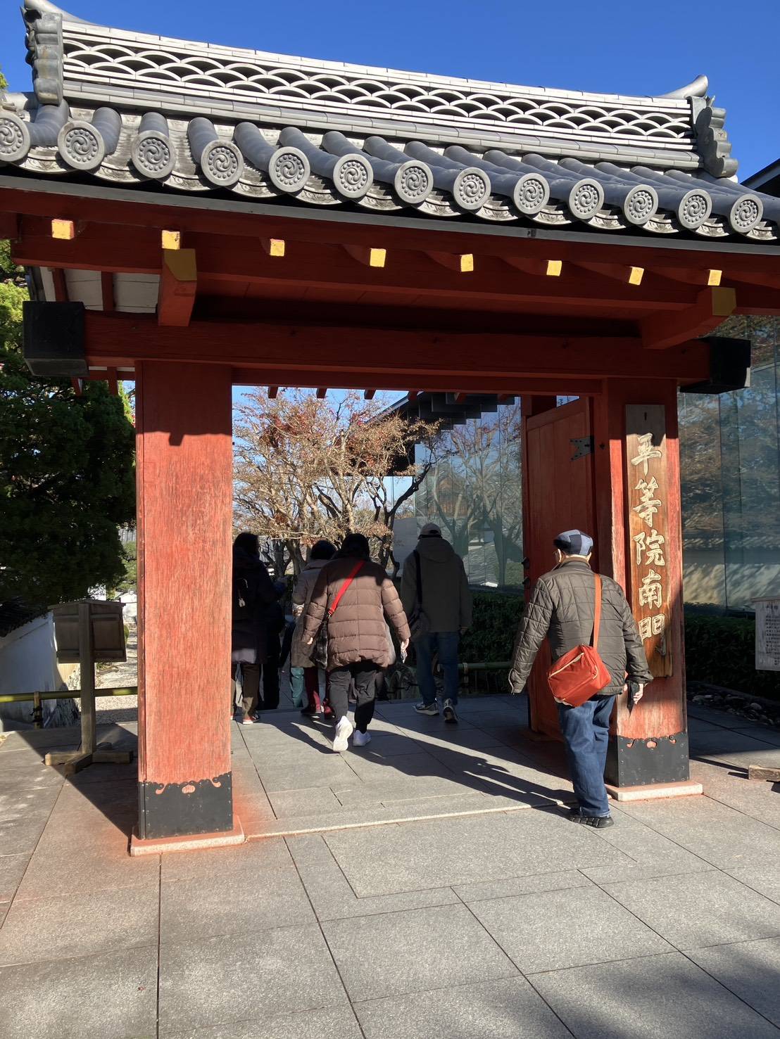 12月16日 2025年最後の郊外研修先は京都府宇治市の平等院と萬福寺でした。10円硬貨の平等院鳳凰堂や1万円札の裏の鳳凰像は共に有名です。その鳳凰堂は静かに池の上に佇んでいるようで初冬の紅葉と相まって見事な景色でした。 鳳凰堂(国宝)は1053年に建立され、その中央には阿弥陀如来像(国宝)が約1000年座しておられます。さらに壁面には阿弥陀如来像を囲むように多くの雲中供養菩薩像や壁画を見ることもできました。 鳳凰堂、ミュージアム鳳翔館などを見て回り平安時代の人々が夢見た西方極楽浄土の中にいるような心持ちがしました。