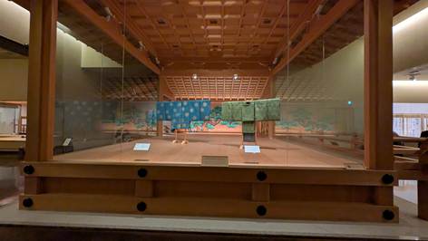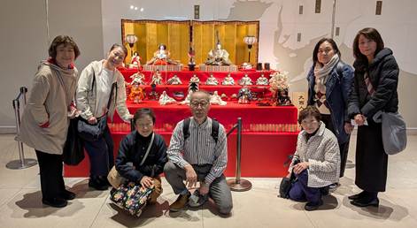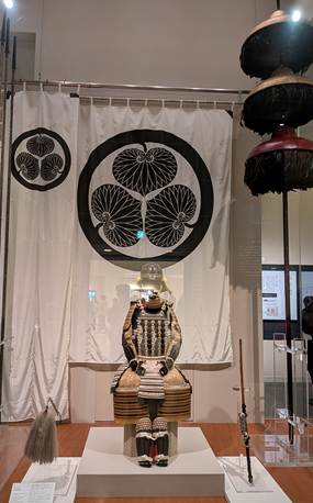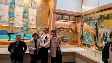 3月3日(火) 東区近郊研修/徳川美術館へ出かけました 生憎の雨模様でしたが、28名の参加で三班に分かれての自由拝観です 松平通温(みちまさ)尾張徳川家(3代綱誠/つななり)19男の展示品のお出迎え! 総大将の馬標や銀箔置白糸威具足、刀剣や八島合戦図屏風などの展示品、名古屋城二の丸御殿能舞台の実物大展示も見事でした。