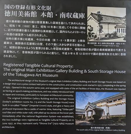 蓬左文庫では、数々の重要文化財(約8点)や国宝(約21点)に圧倒される フロアーに描かれていた名古屋城下図に当時の街並みに思いを馳せ会話も弾む 徳川美術館 本館・南収蔵庫は≪国の登録有形文化財≫で、当時の展示棟と収蔵庫、本館の一部と南収蔵庫は、織部焼の瓦屋根と白壁、その下部に大きな伊豆石を積み上げ、城郭を思わせる重厚さを表した帝冠様式建築とのことです。