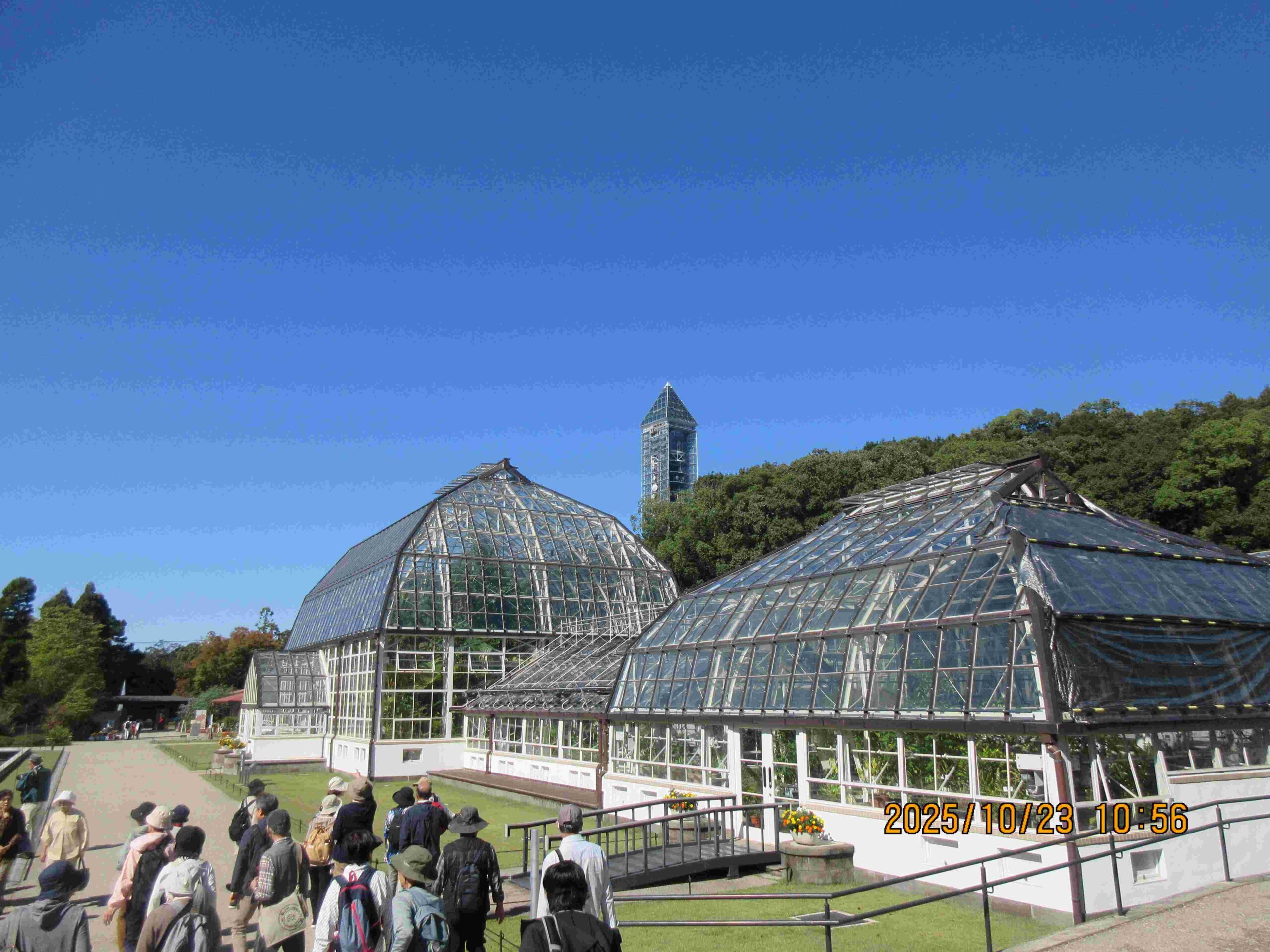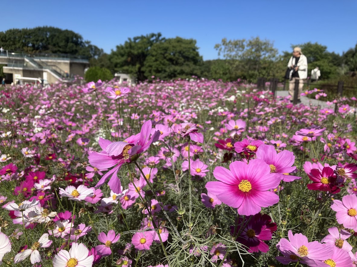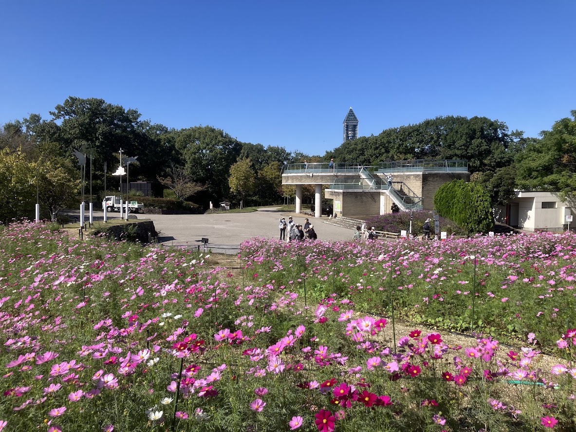 天気は秋晴れの快晴、健康ウオーキングには最適の湿度と気温で最高の一日でした!植物園内のお花畑では色とりどりのコスモスが風に揺れて、とてもきれいでした。また、展望台から遠くにくっきりと見えた名古屋駅近隣が素敵でした。