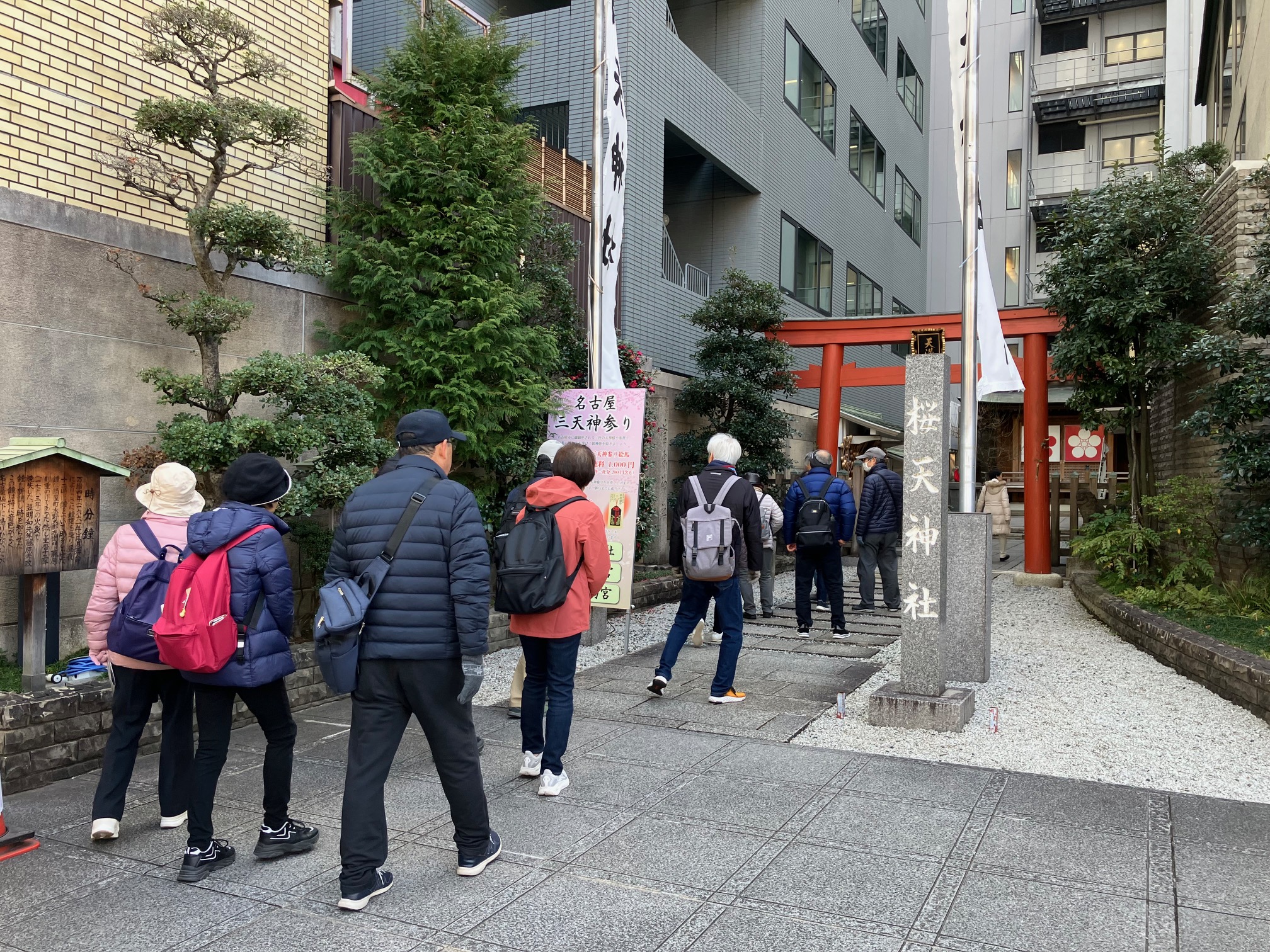 ウォーキング経路 地下鉄東山線栄駅東改札口集合・出発⇒セントラルパーク地下街⇒久屋大通駅5A出口⇒桜通呉服町⇒桜通本町⇒桜天神社⇒那古野神社⇒名古屋東照宮⇒五条橋⇒国際センター駅出入口⇒ユニモール地下街⇒名古屋駅到着・解散 晴天に恵まれたため、セントラルパーク地下街をショートカット、中部電力MIRAI TOWER付近から地上に出て、暖かな日差しを浴びてのウォーキングになりました。 桜天神社、那古野神社、名古屋東照宮ではそれぞれが思い思いの願い事をしてお参りしました。五条橋を渡ると以前ウォーキングした円頓寺商店街が見えており、懐かしさを感じました。国際センター駅からユニモール地下街に入り、名古屋駅に到着して解散となりました。