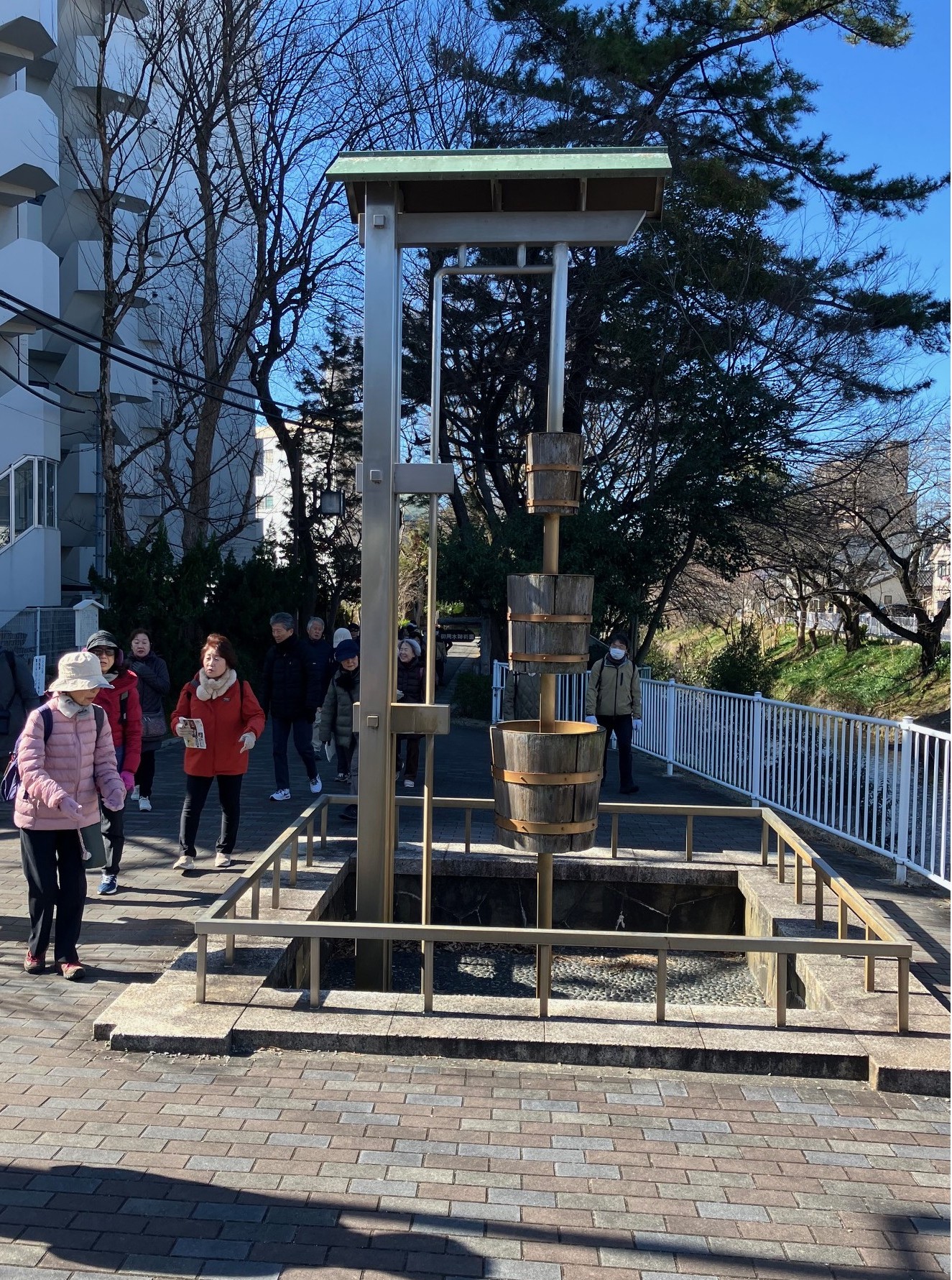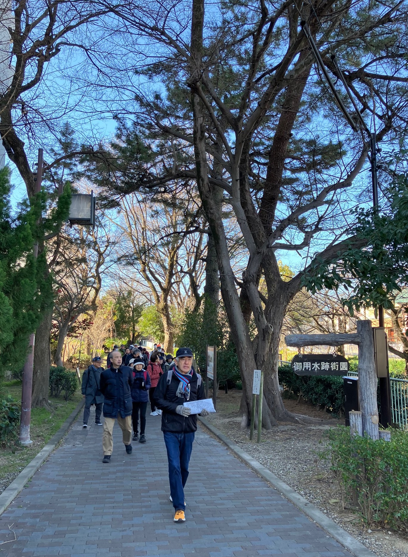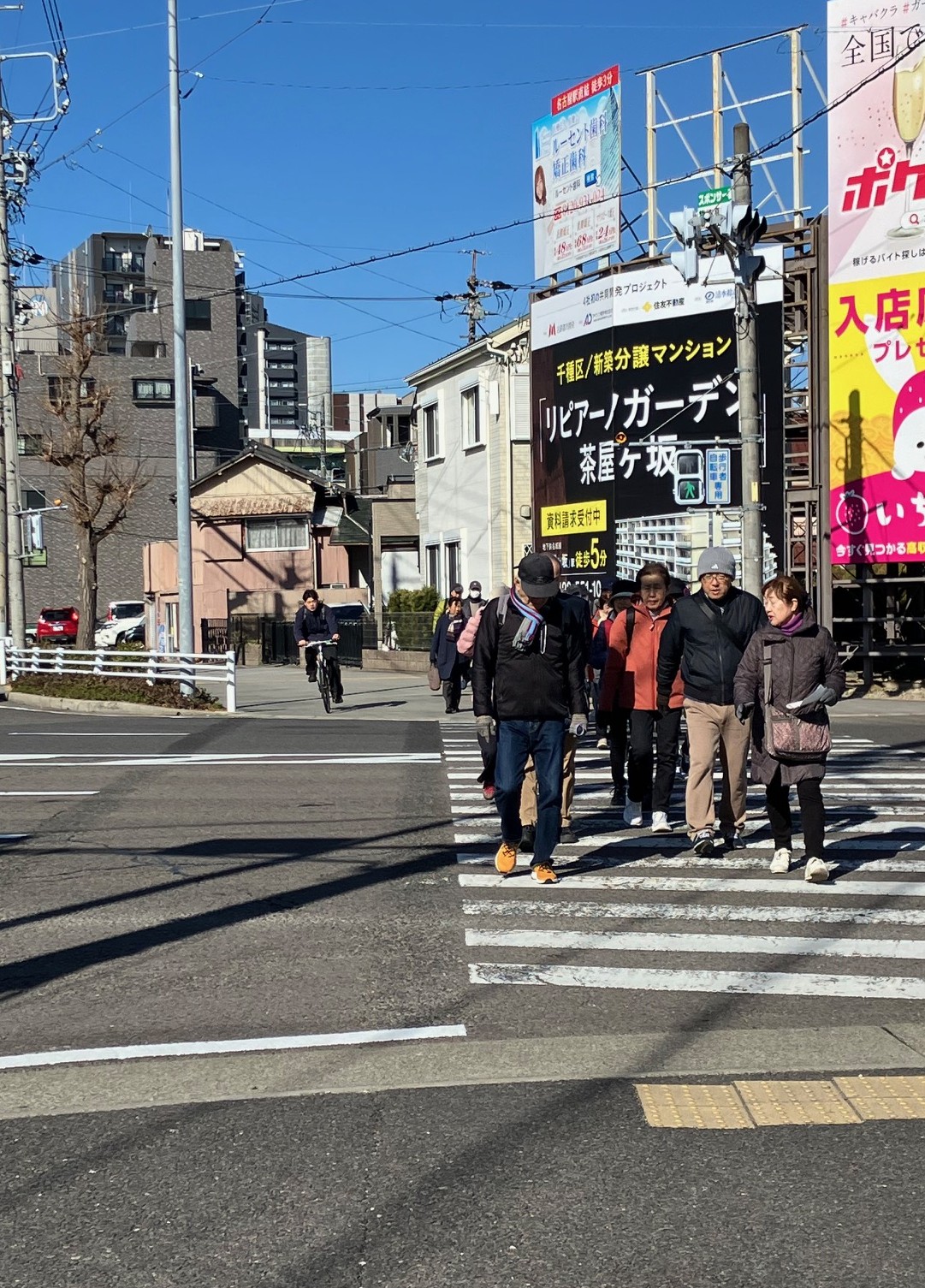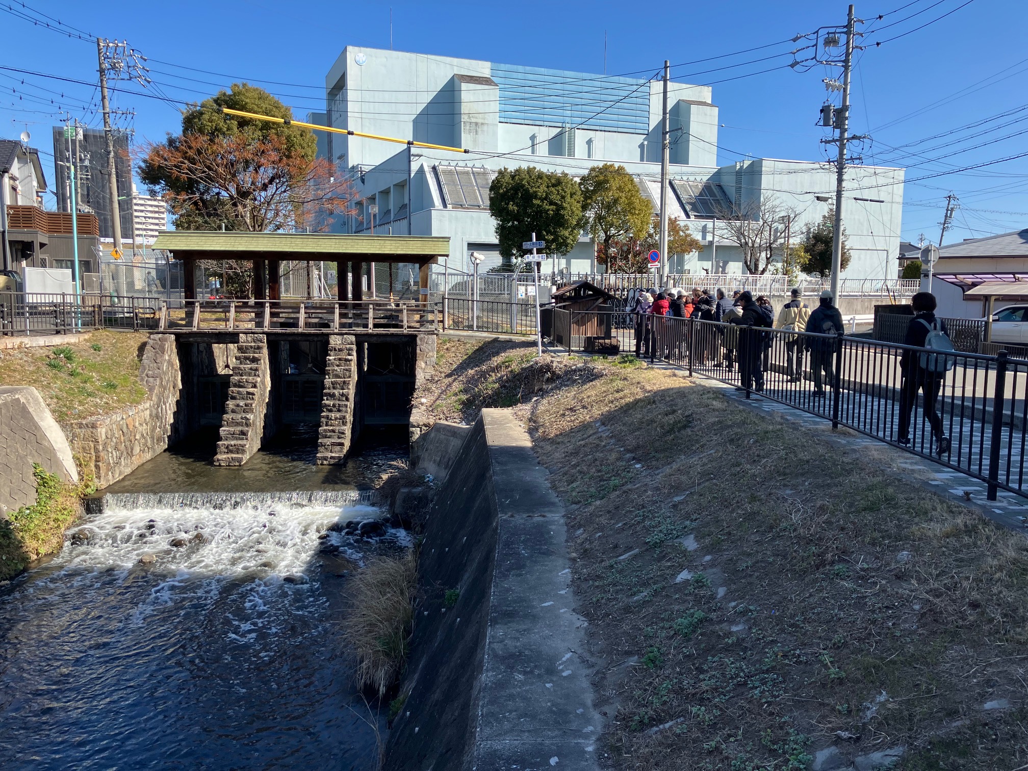ウォーキング経路 地下鉄名城線黒川駅東改札口に集合・出発⇒御用水跡街園⇒黒川樋門⇒御成通3丁目⇒山田天満宮⇒大曽根駅に到着・解散 晴天に恵まれましたが、風がときどき強く吹いたため、日向では暖かな日差しですが日陰では寒さのために体が震えるほどのウォーキングになりました。 御用水跡街園は、思ったより長い距離で驚きました。黒川樋門は、庄内川から黒川(堀川)へ用水を引くために設けた樋門(ひもん)で、矢田川の地下を通って黒川へ流れ込み、3連の樋門に2つの石段、巻上機の上屋は木造で復元され、樋門の上も人が通れるようになっていたため、黒川の景観をより身近に感じさせるものでした。山田天満宮は、梅の花も咲いていました。敷地内には金神社や御嶽神社もあり、それぞれお参りしました。その後、大曽根駅に到着して解散となりました。