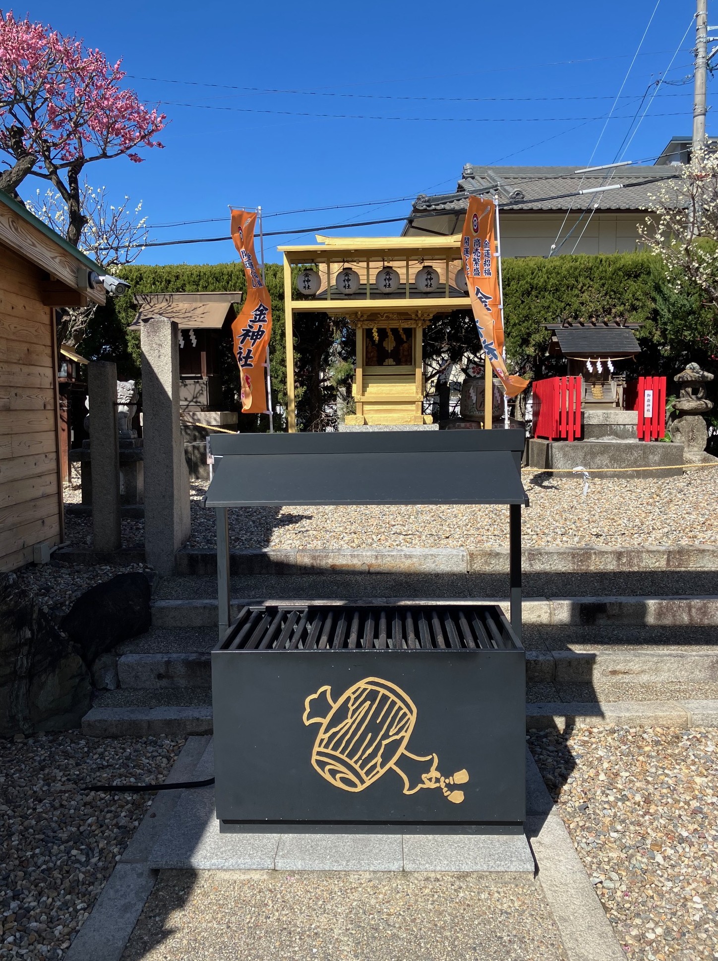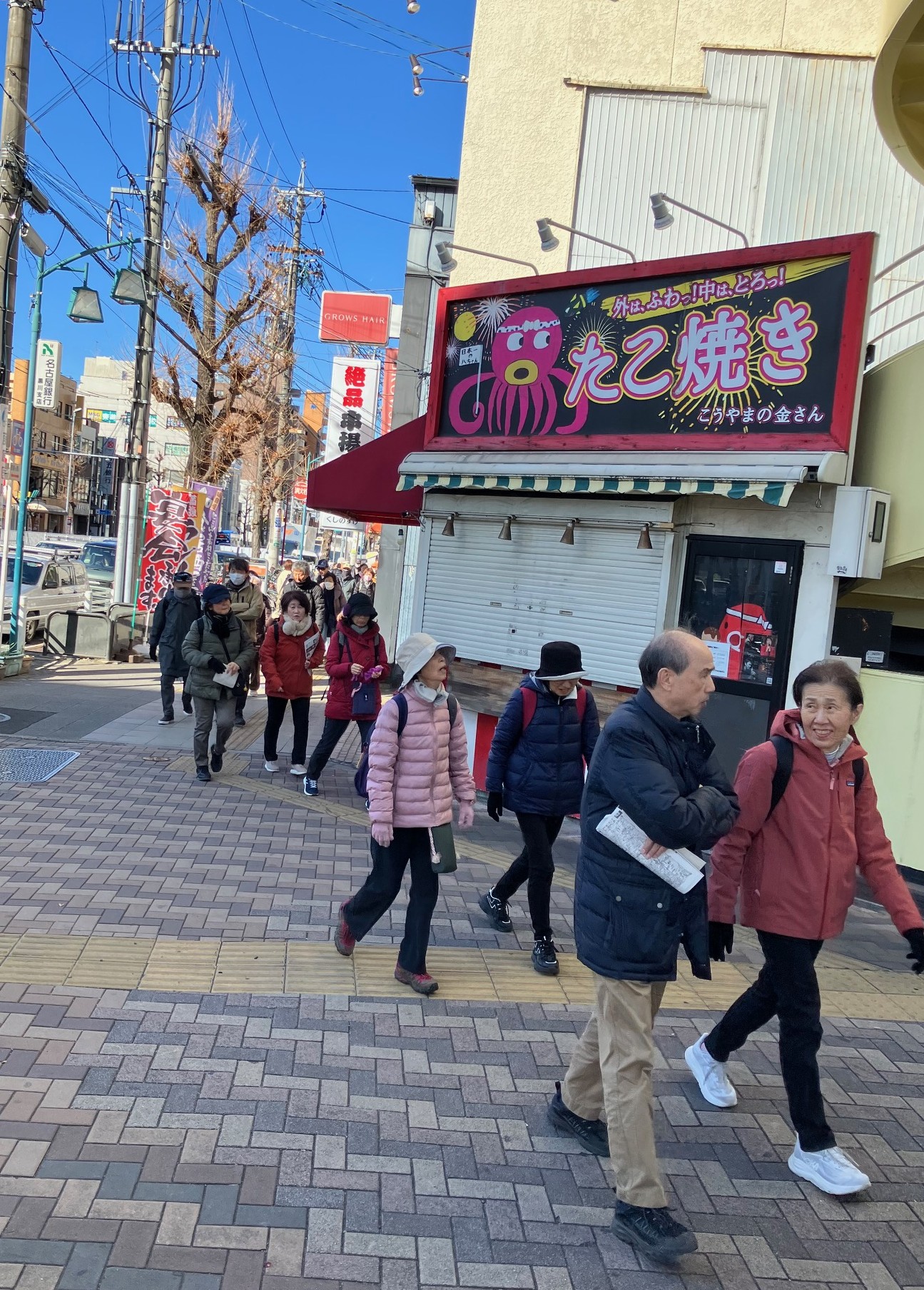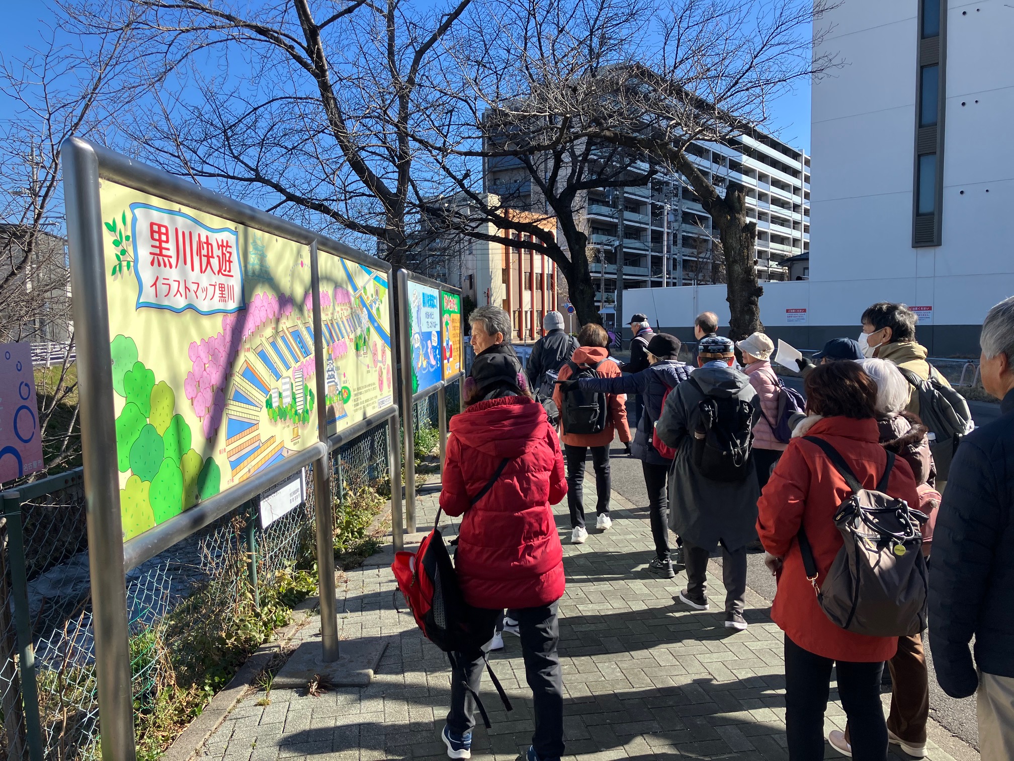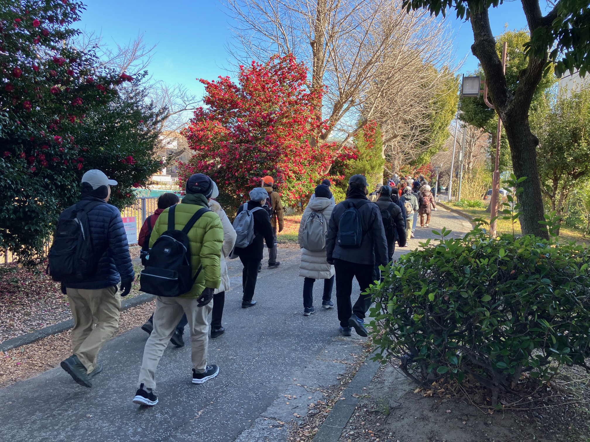 ウォーキング経路 地下鉄名城線黒川駅東改札口に集合・出発⇒御用水跡街園⇒黒川樋門⇒御成通3丁目⇒山田天満宮⇒大曽根駅に到着・解散 晴天に恵まれましたが、風がときどき強く吹いたため、日向では暖かな日差しですが日陰では寒さのために体が震えるほどのウォーキングになりました。 御用水跡街園は、思ったより長い距離で驚きました。黒川樋門は、庄内川から黒川(堀川)へ用水を引くために設けた樋門(ひもん)で、矢田川の地下を通って黒川へ流れ込み、3連の樋門に2つの石段、巻上機の上屋は木造で復元され、樋門の上も人が通れるようになっていたため、黒川の景観をより身近に感じさせるものでした。山田天満宮は、梅の花も咲いていました。敷地内には金神社や御嶽神社もあり、それぞれお参りしました。その後、大曽根駅に到着して解散となりました。