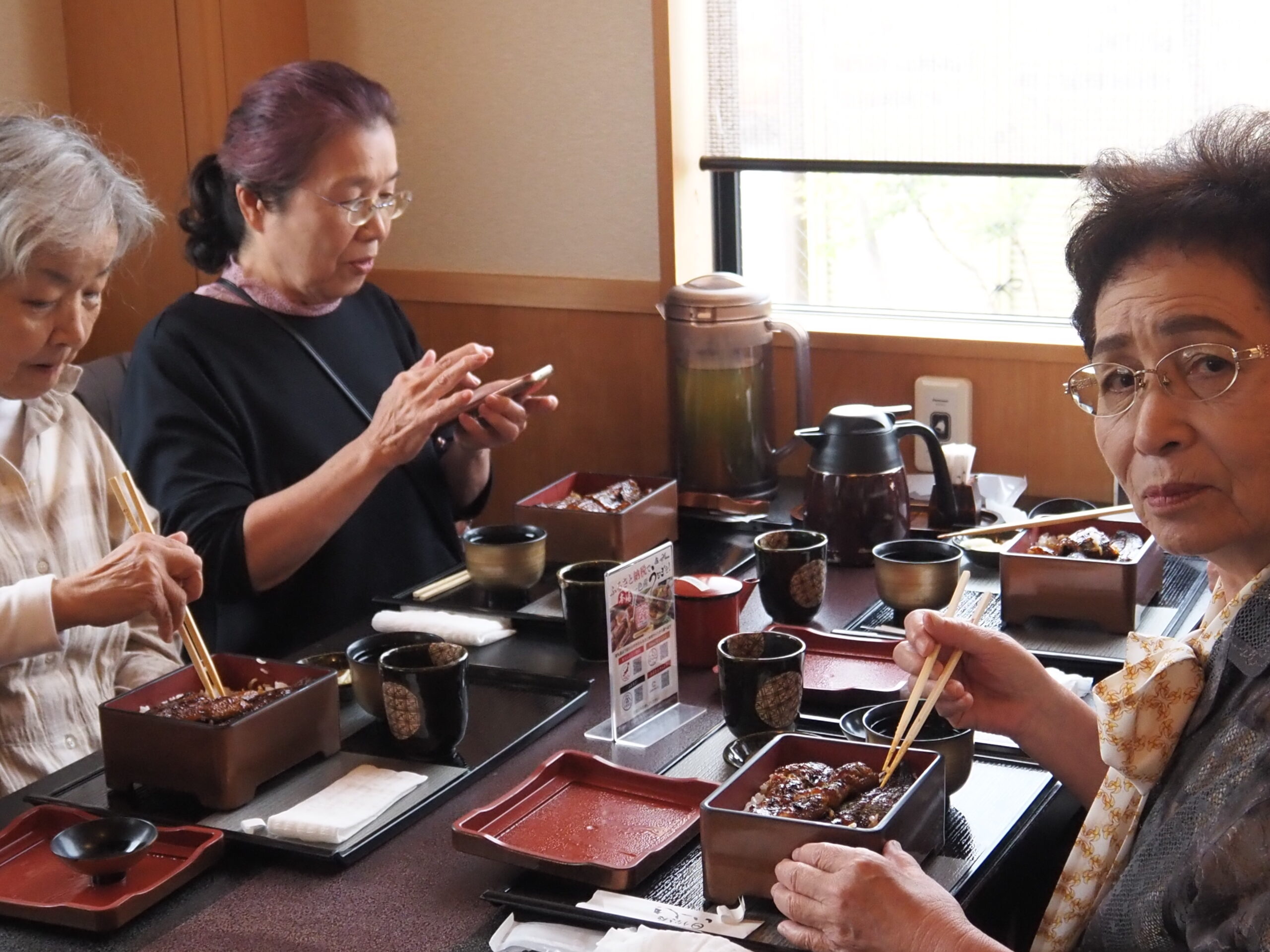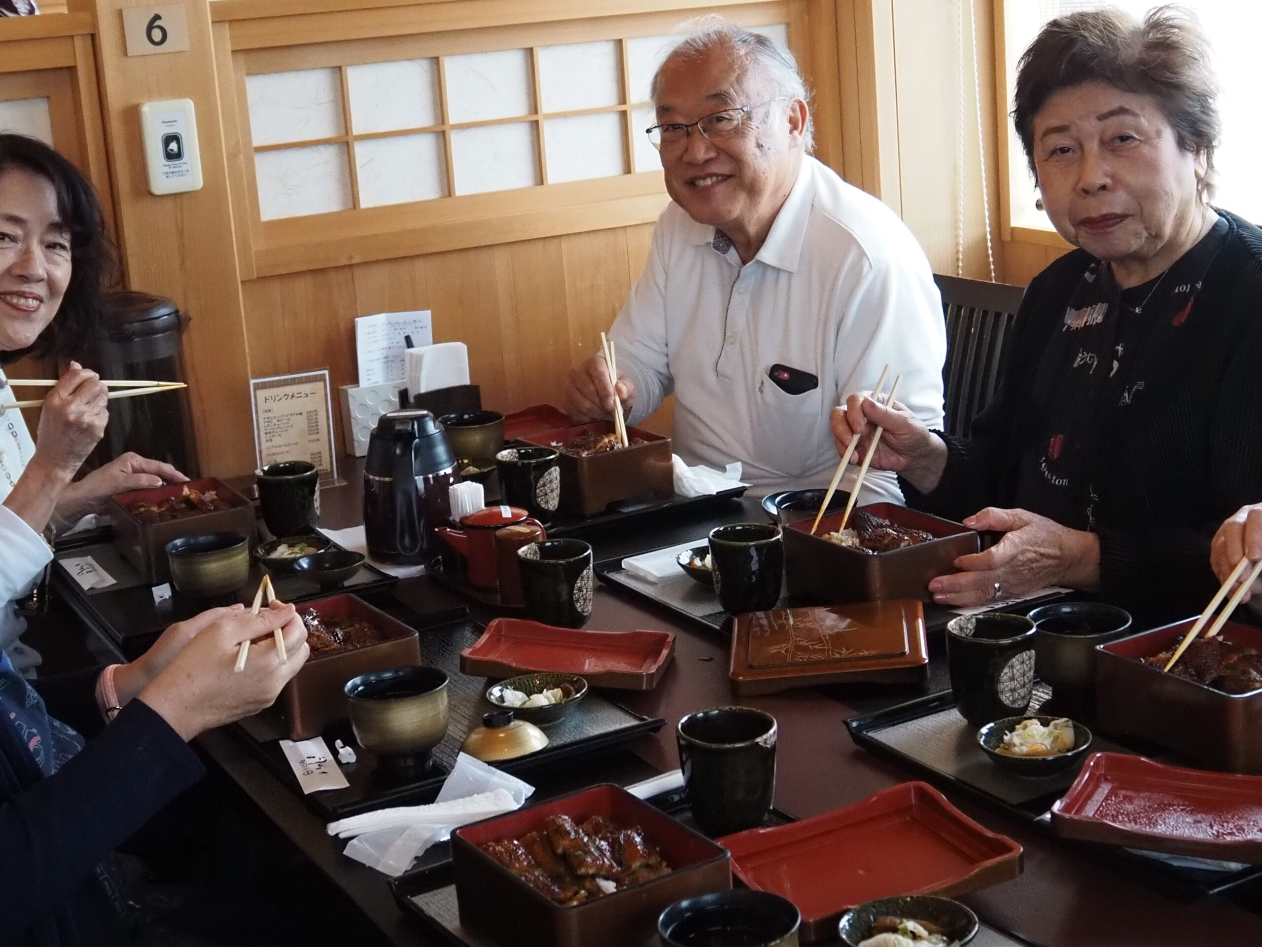 今日は「西三河吉良~西尾を訪ねて」という企画でバス旅行を兼ねて研修見学しました。道路の渋滞である寺院の見学をやめて最初に一色さかな広場で昼食をとりました。うなぎの昼食でした。