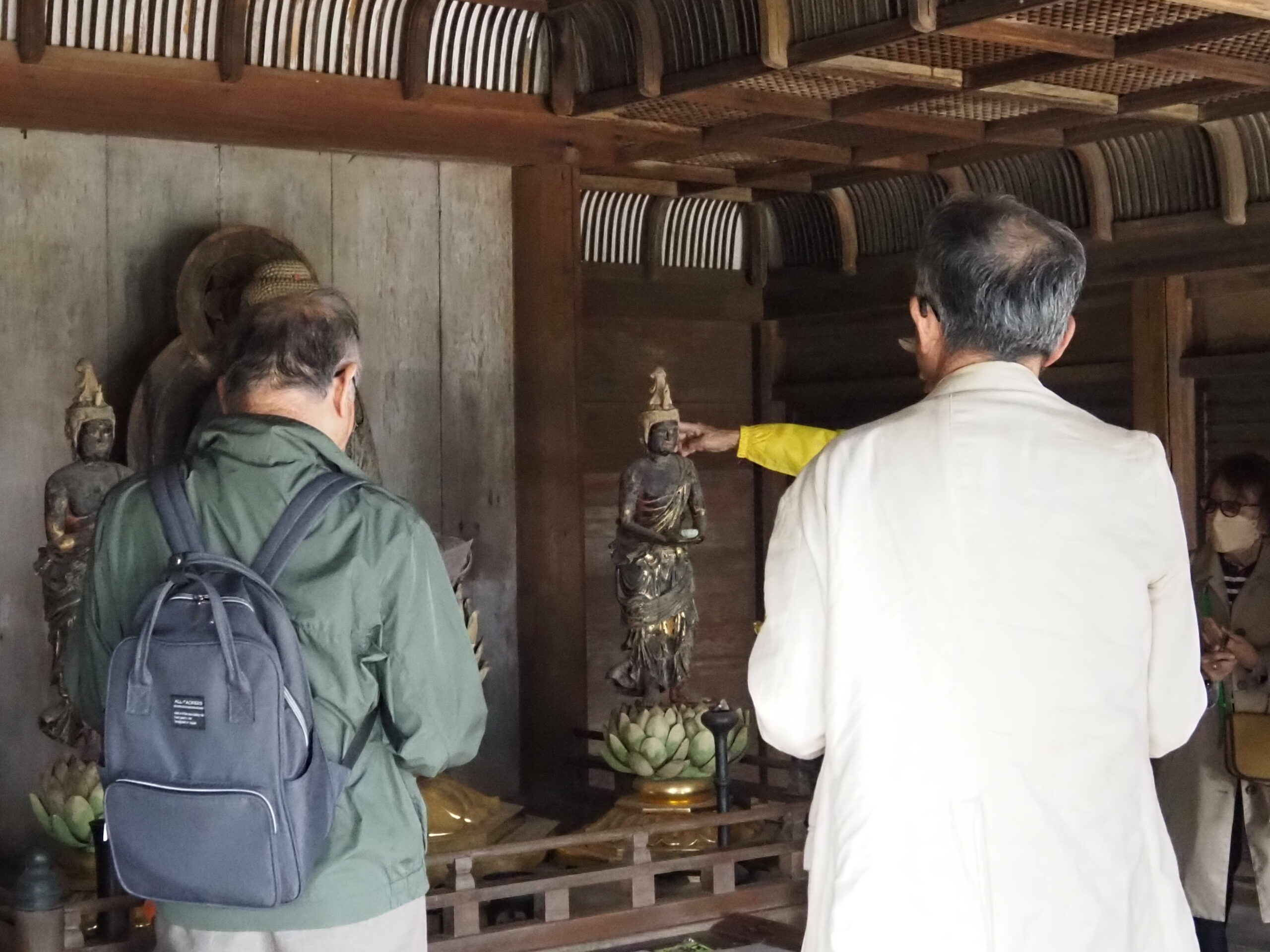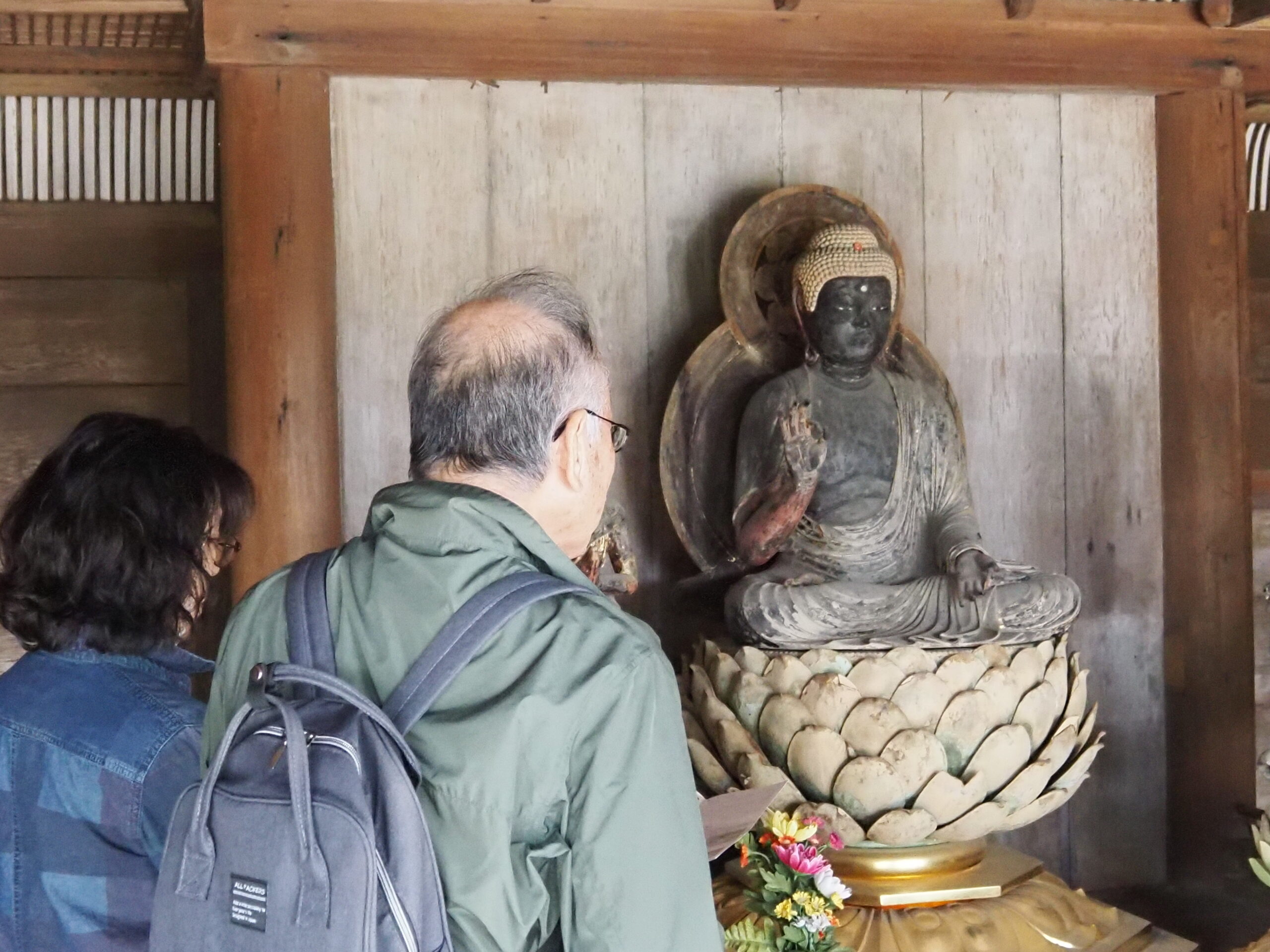 金蓮寺弥陀堂の本堂には、阿弥陀三尊像が安置されていました。この仏像は鎌倉時代に製作されたものだそうです。当時のまま安置されていました。当時は金ピカであったそうです。いまは金がはがれてところところで金が残っている状態でした。