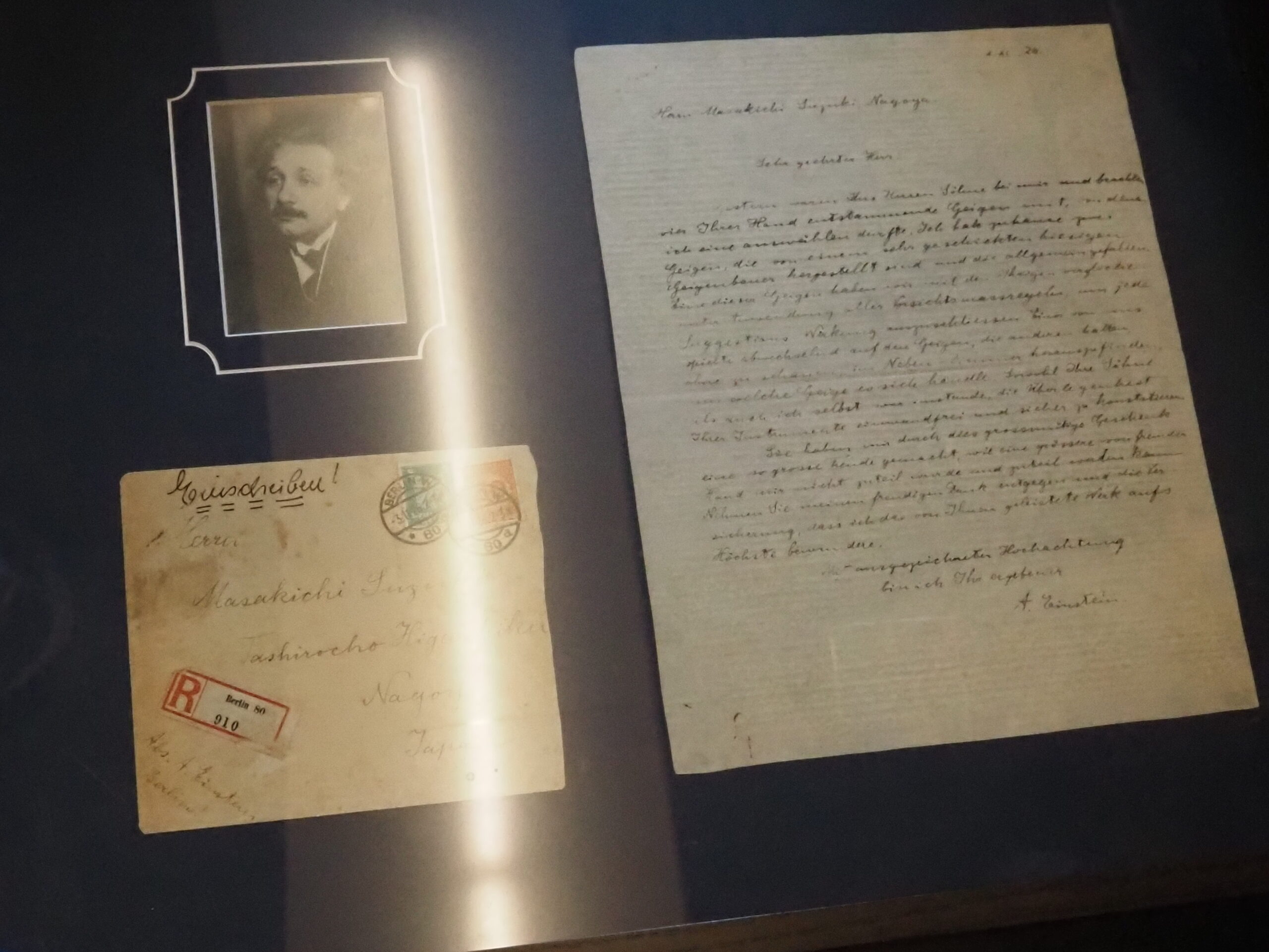 1926年政吉の長男梅雄、次男慎一がドイツに留学して政吉が完成させた。バイオリンをアインシュタイのまえで披露してドイツのバイオリンと弾き比べをして、アインシュタインに絶賛されたそうです。アインシュタイの賞賛の手紙が展示してありました。