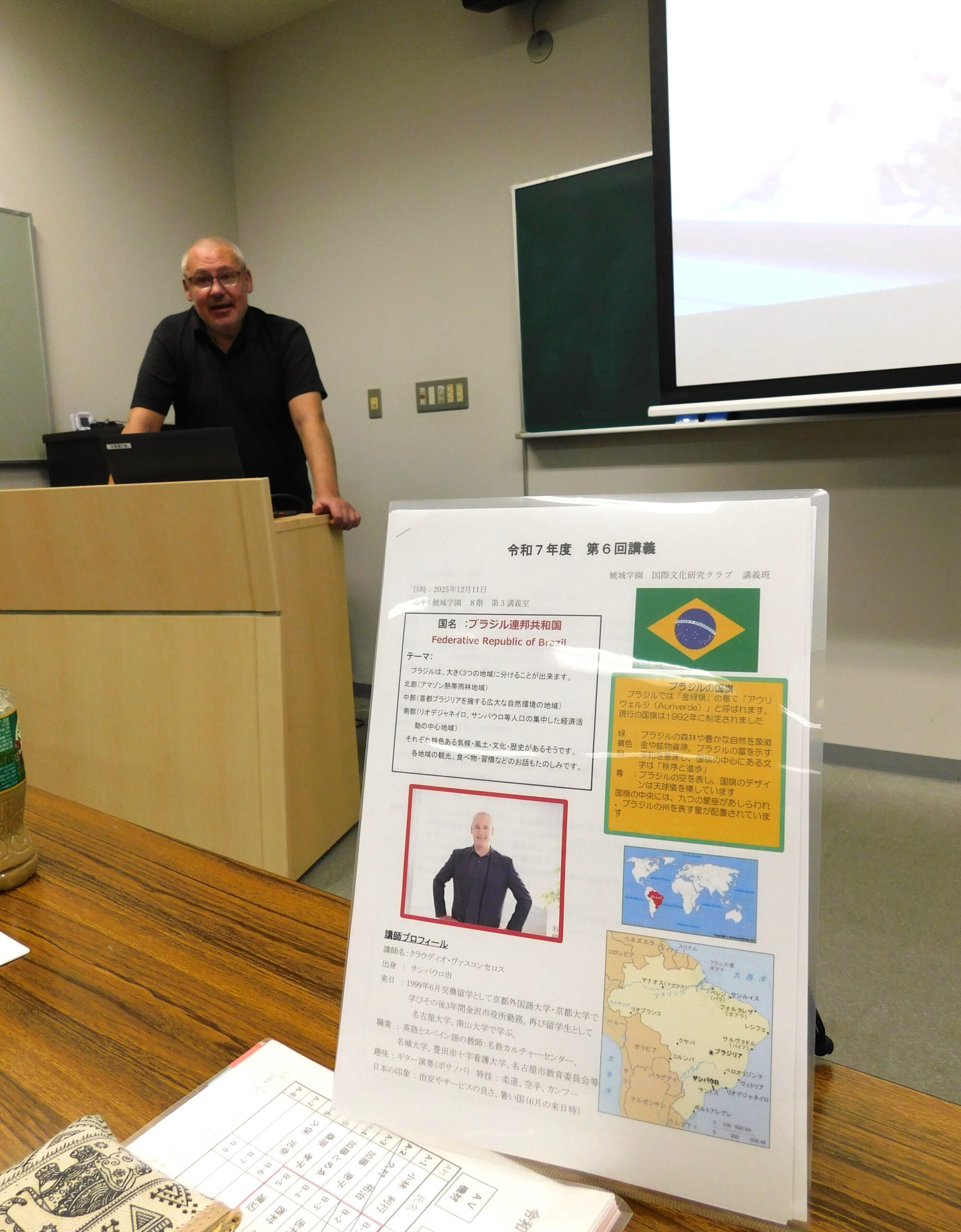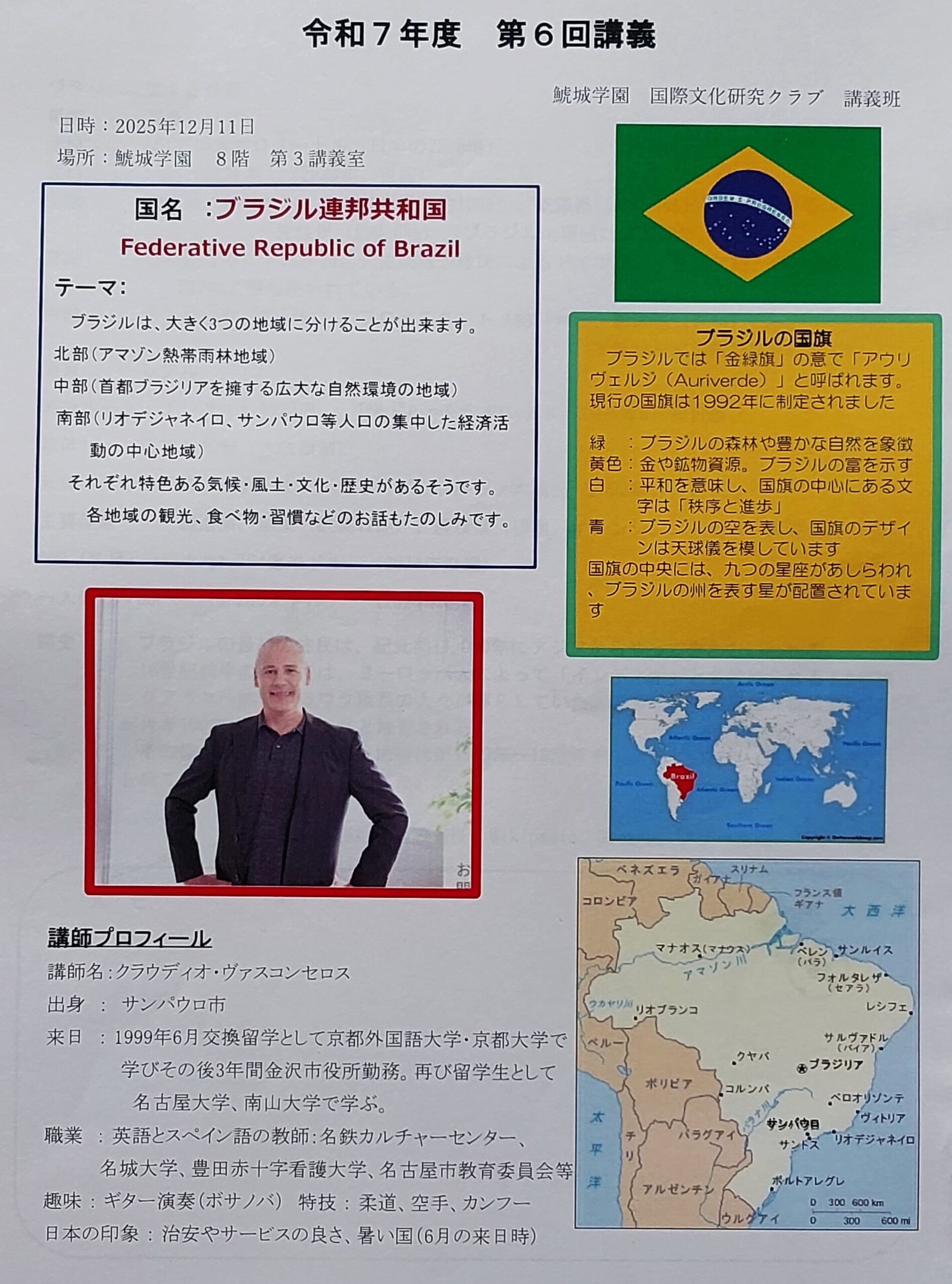 2025年度 第6回目となります講義は、12月11日ブラジル サンパウロ出身で、現在名古屋で英語とスペイン語の教師をされておられますクラウディオ・ヴァスコンセロスさんをお招きし、『ブラシル講義』を開催いたしました。 ブラジルの歴史・経済・文化・観光・食べ物・習慣等について解りやすくお話 いただきました。 また日本の文化との違い等についても楽しく講義していただきました。
