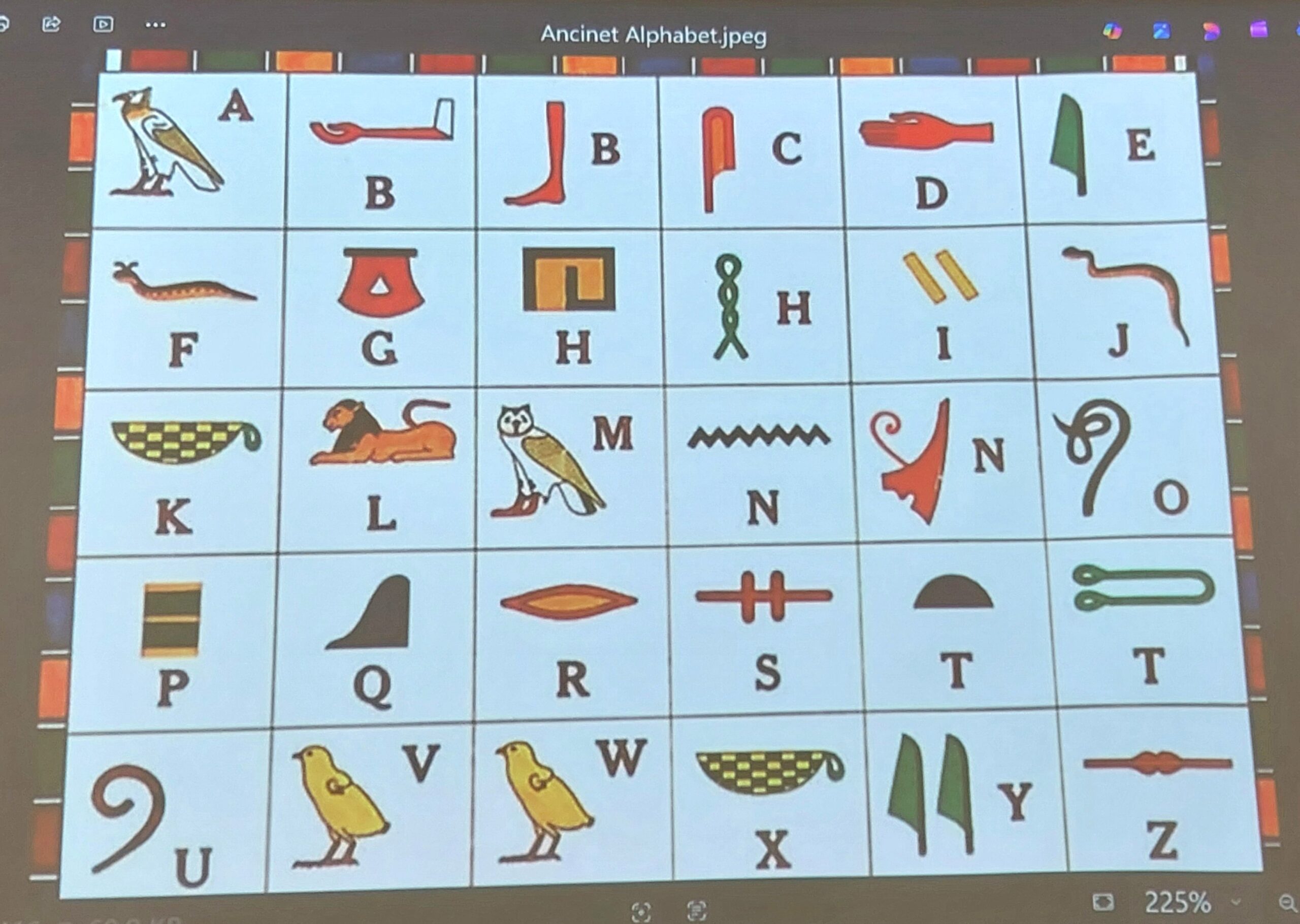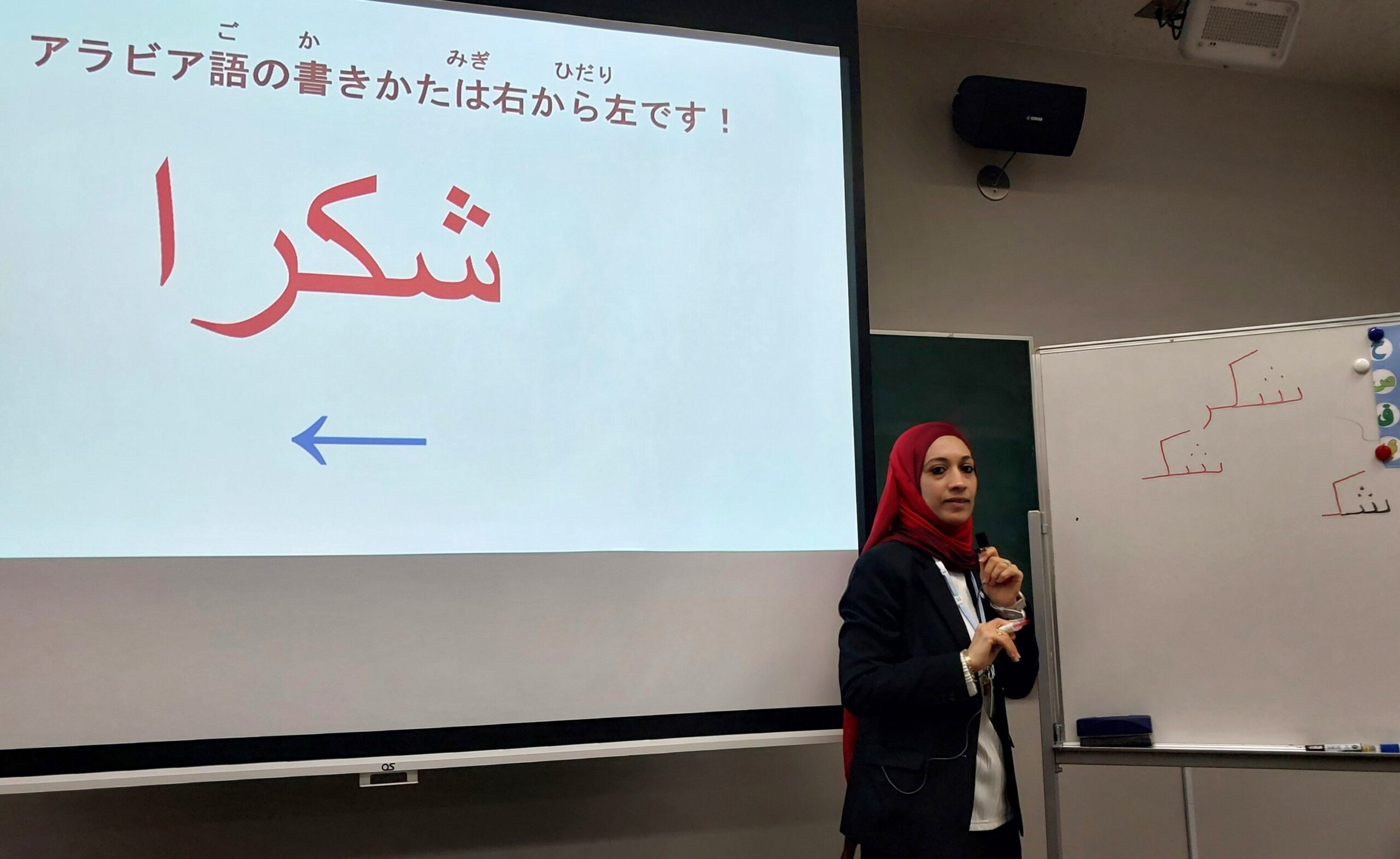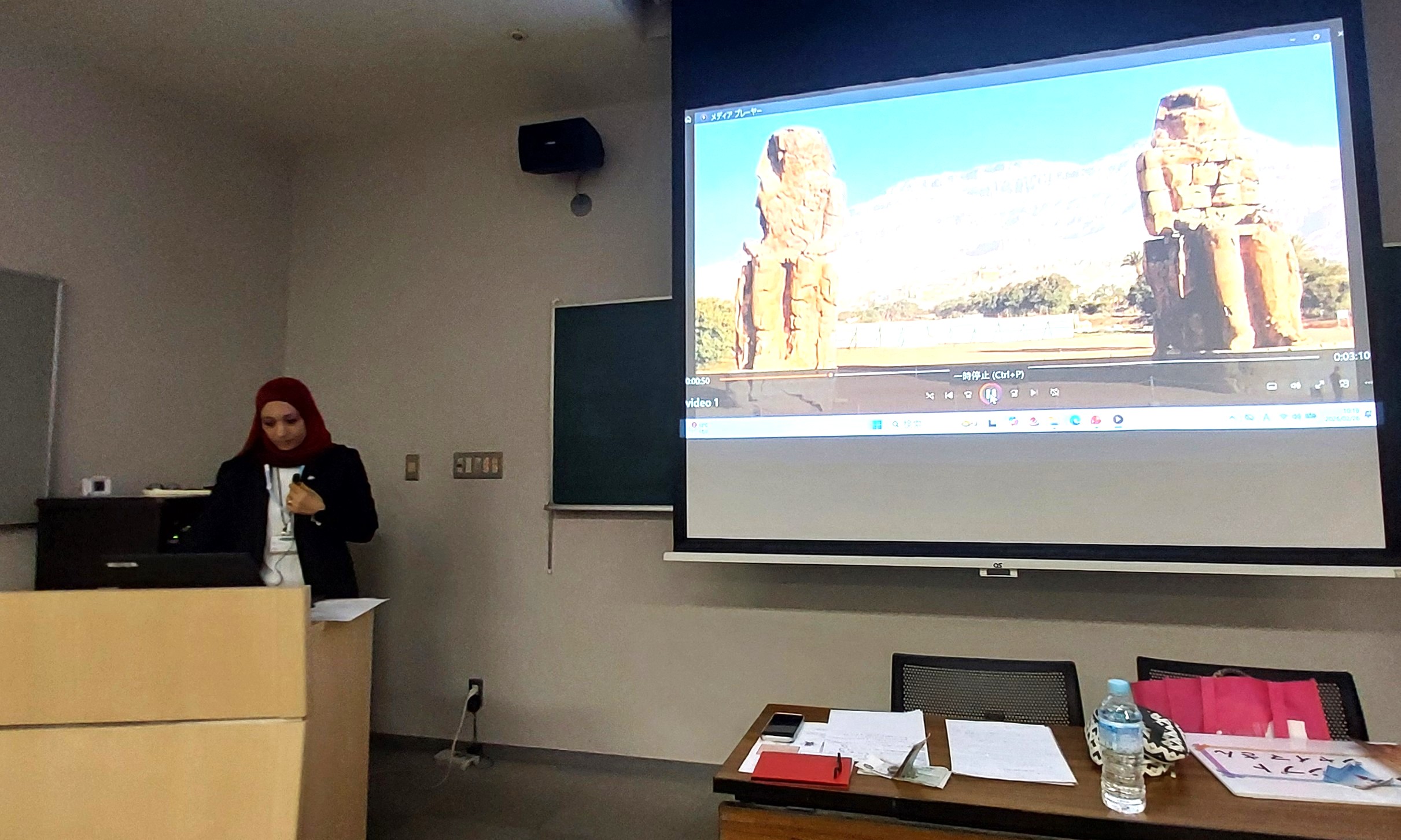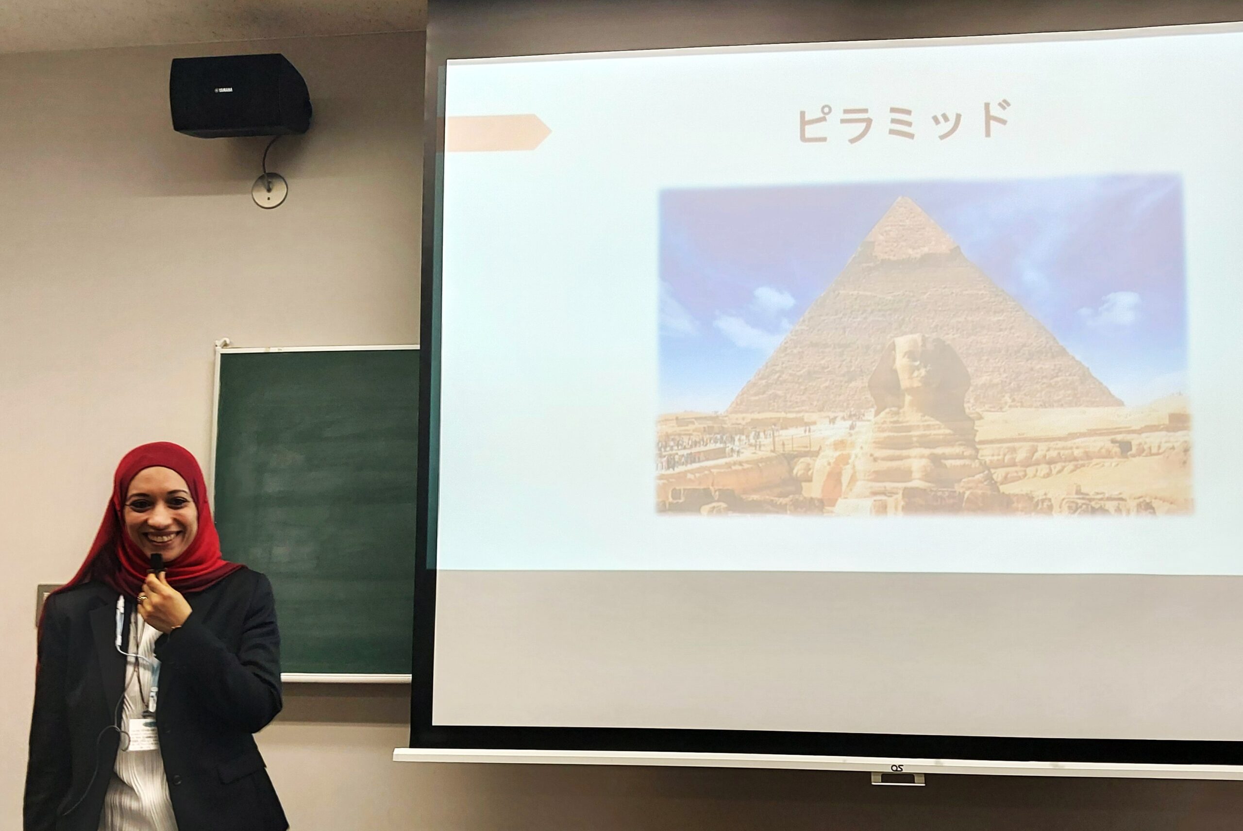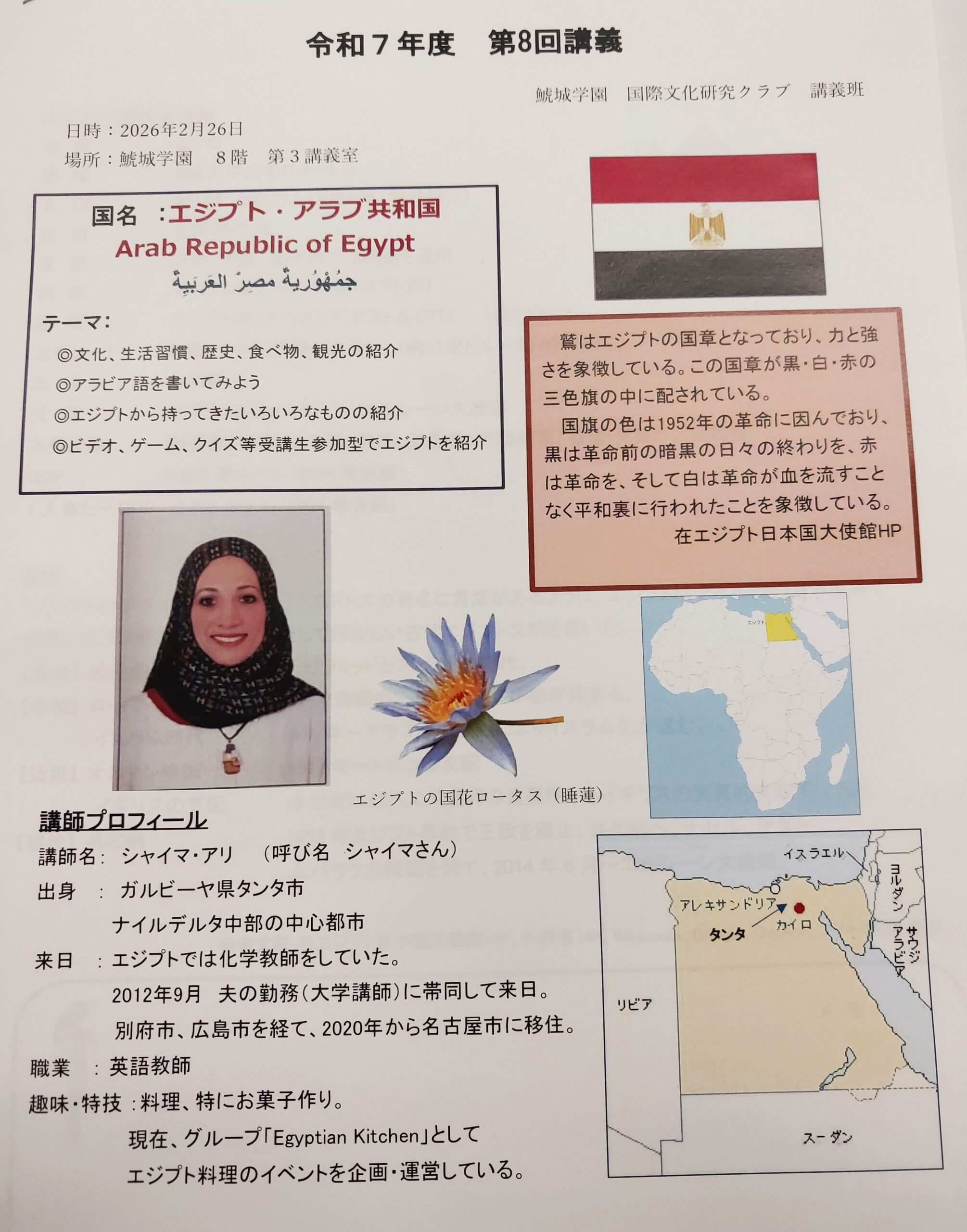 令和7年度の最後となる第8回『エジプト・アラブ共和国』講義を 開催いたしました。講師のシャイマ・アリさんは、2012年にご主人 の勤務の都合で来日され、別府市、広島市を経て2020年から名 古屋で英語教師としてご活躍されておられます。 世界四大文明のひとつである「古代エジプト文明」から現在に至る 歴史と文化、生活習慣、食べ物ならびに観光について解りやすく講義していただきました。また、アラビア語と象形文字のレクチャーもあり、象形文字で自分の名前を書くと言う貴重(?)な経験をする事 もできました。
