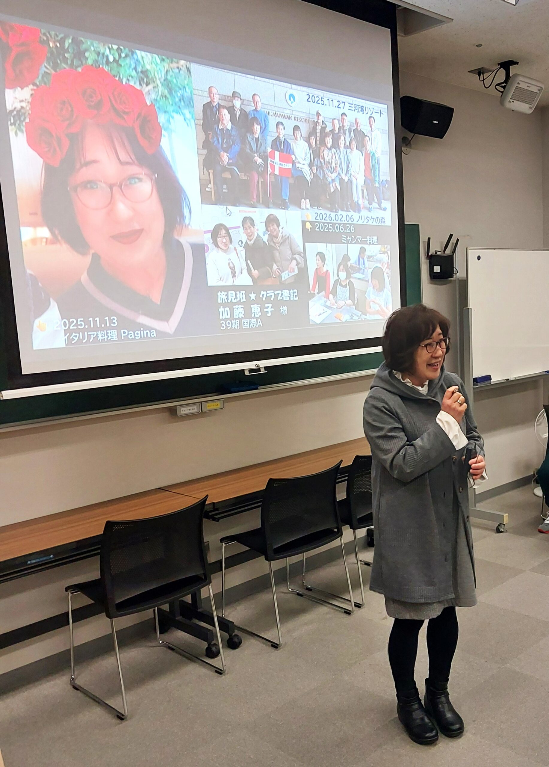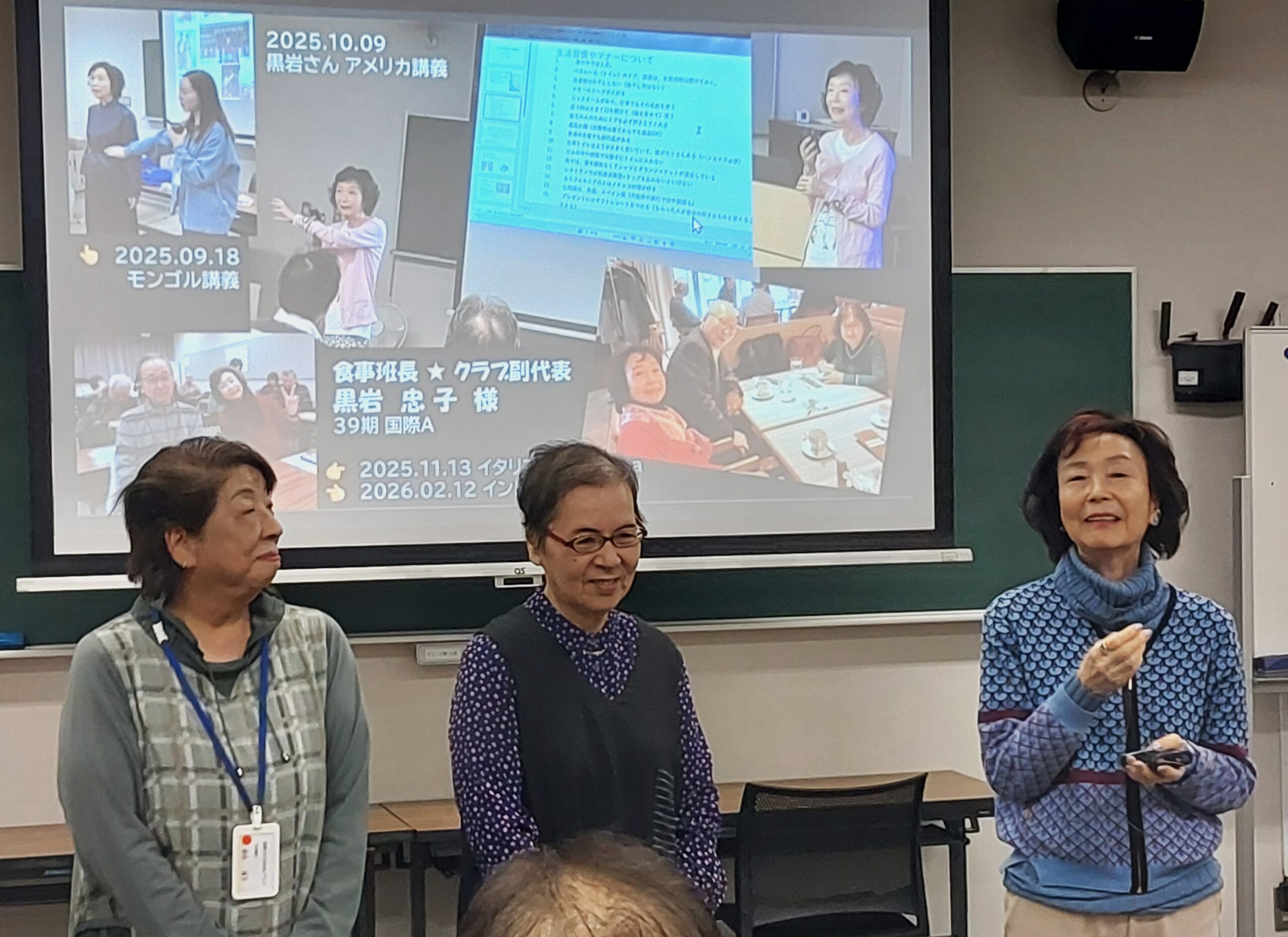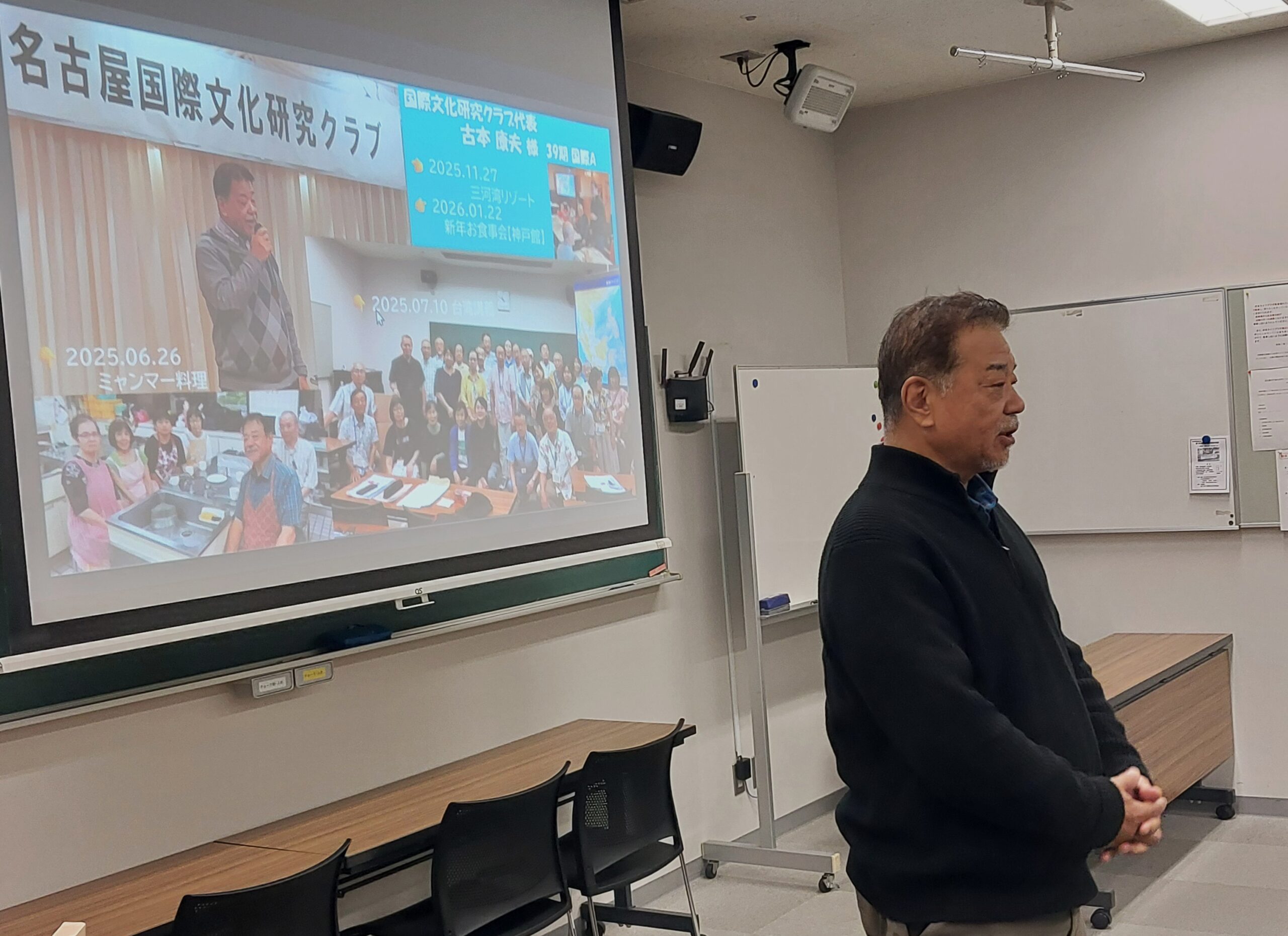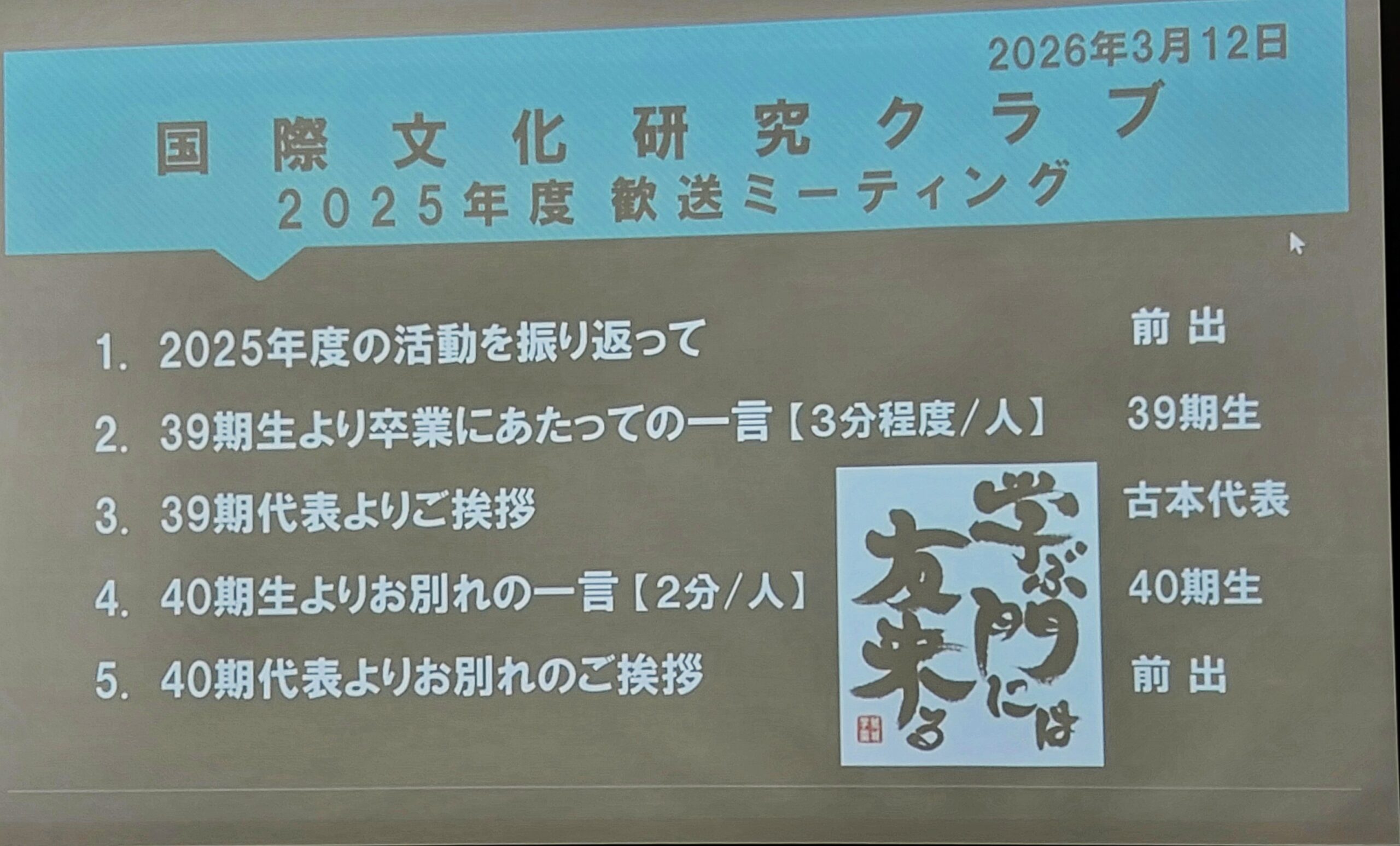 25年度最後となるクラブ活動日に、卒業される39期生の『歓送パ~ティ』を開催いたしました。 最初に各班毎の企画行事をスクリーンに映し出し、この1年間の活動状況を振り返りました。 そして39期生一人ひとりから、2年間の鯱城学園ならびにクラブでの思い出話や卒業にあたっての挨拶等を受け、心ばかりの記念品を贈呈させて戴きました。 その後40期生全員から感謝とお別れの言葉が述べられ、39期生と40期生で共に歩んできた1年間に渡るクラブ活動が無事終了いたしました。
