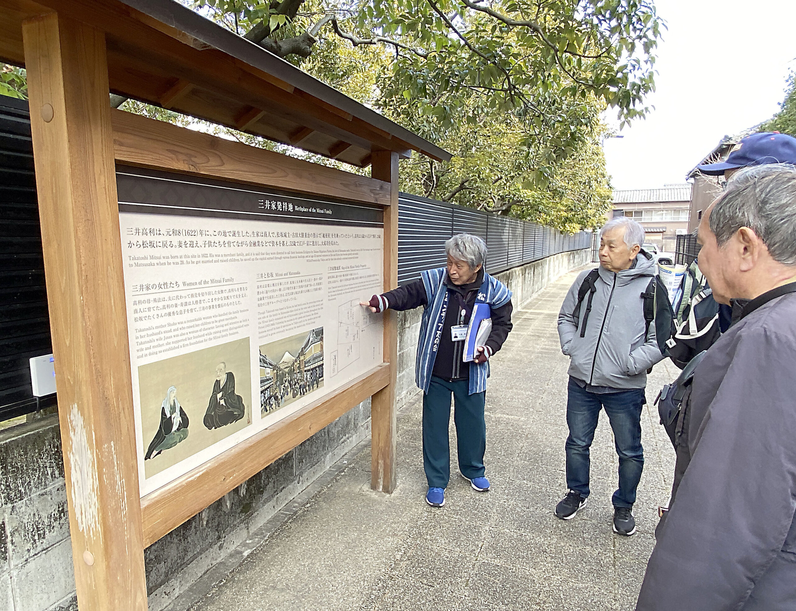 1月29日、17名で「豪商の町松坂」を散策しました。JR名古屋駅に8時20分集合、8時37分発「快速みえ1号」鳥羽行きに乗車、9時54分にJR松坂駅に到着しました。改札で出迎えてくださったボランティアガイド3名と合流。松坂は戦争で空襲に遭わなかったため、昔のままの区画が残っていると紹介されながら街並みを散策しつつ「三井家発祥の地」「旧小津清左衛門家」「本居宣長旧宅跡地」「旧長谷川治郎兵衛家」を巡りました。三井、小津、長谷川など松坂の豪商は、この町の礎を築いた戦国武将「蒲生氏郷」が、近江の国から商人を招いたことが始まりだとの説明を受けました。江戸時代、松坂商人は「伊勢商人」と呼ばれ、日本三大商人の一つとして名を馳せていたそうです。