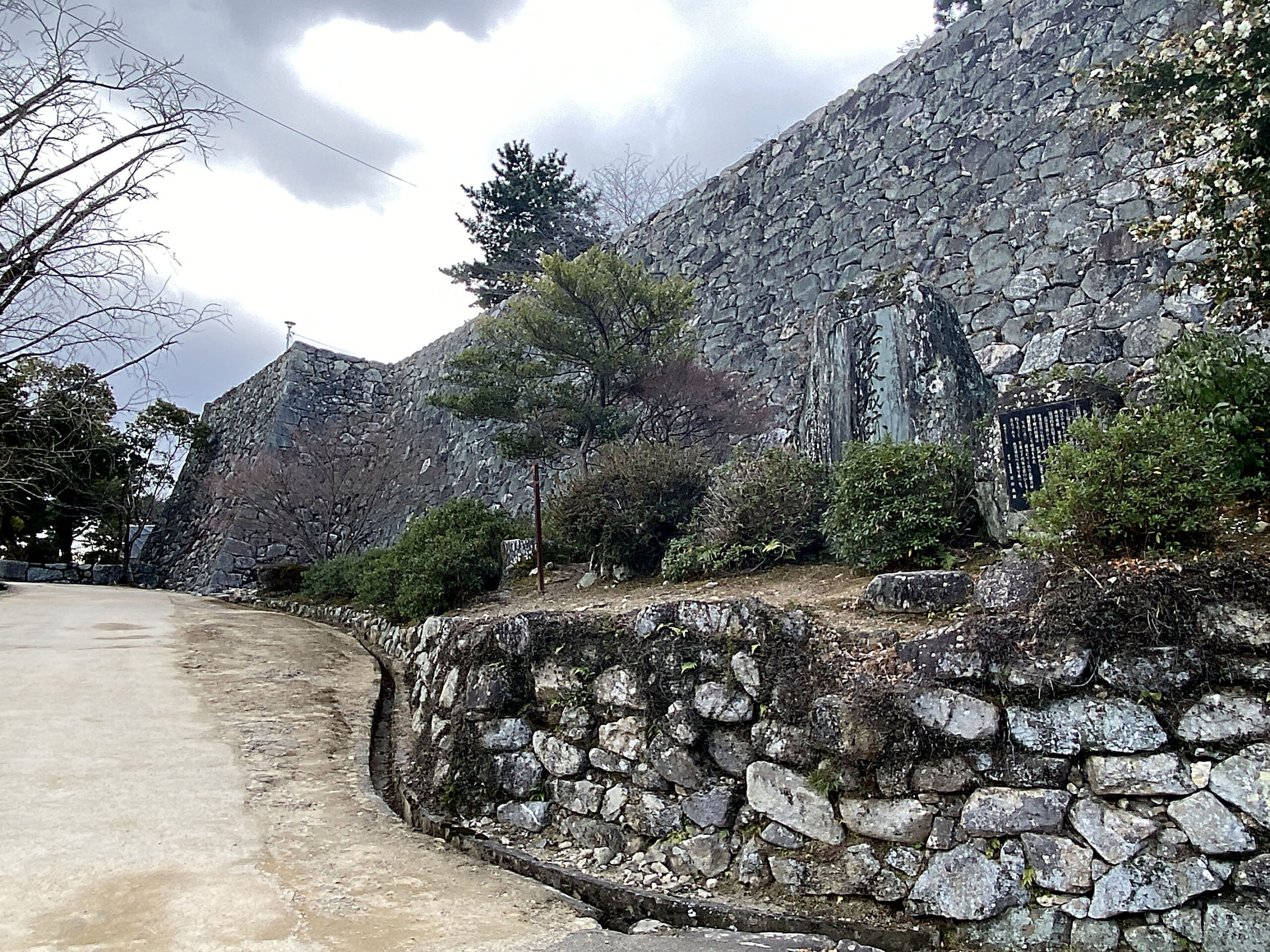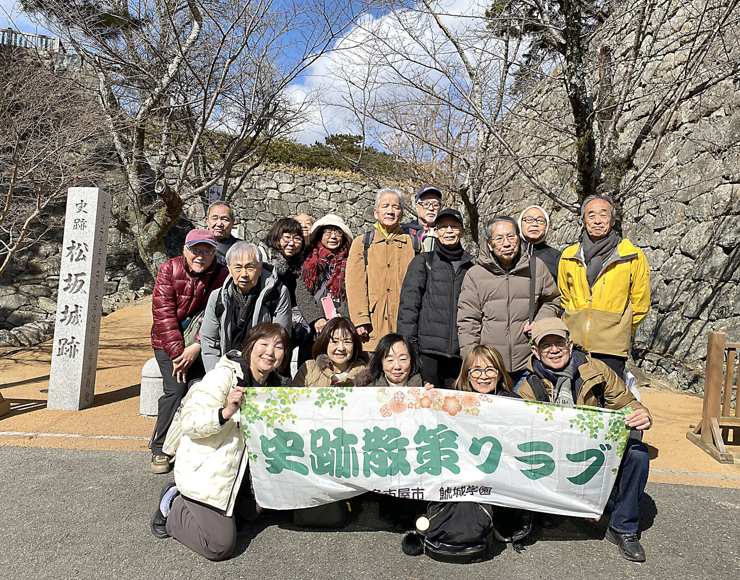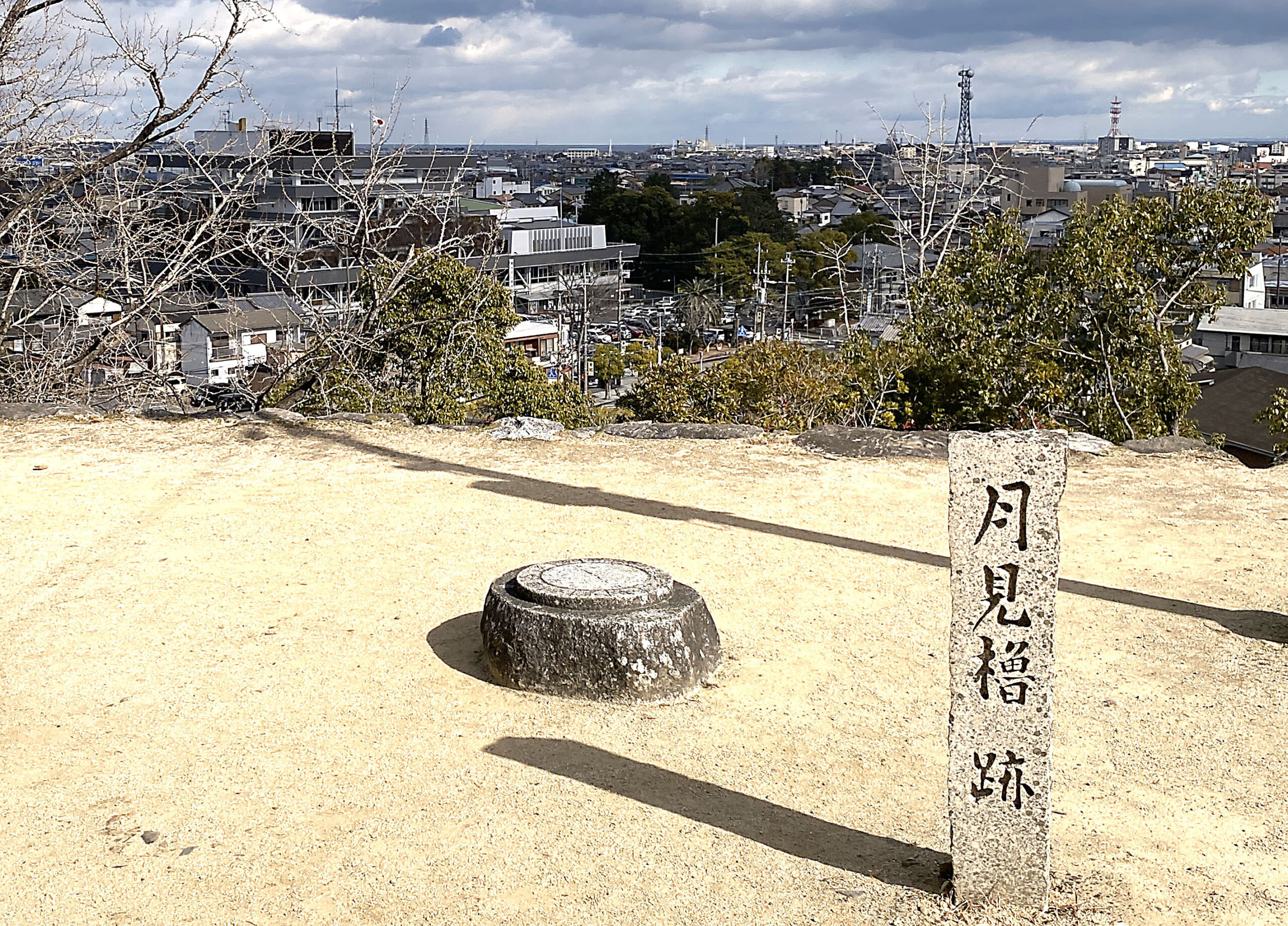 「豪商の町」を過ぎ、いよいよ松坂城へ向かいました。松坂城址は現在「石垣」しか残っていませんが、蒲生時代の「野面積み」江戸時代の「打込みハギと算木積み」など、それぞれの時代の石垣が残っています。さらに「転用石」などもあり(説明では、この辺りにあった古墳の石棺のフタというものもありました)、そして石垣自体も大きく高くそびえるスケールの大きな城址だと感じました。当日は少し寒く雲も多かったのですが、本丸跡や月見櫓では松坂の町並みはもちろん、伊勢湾、知多半島まで望むことができました。