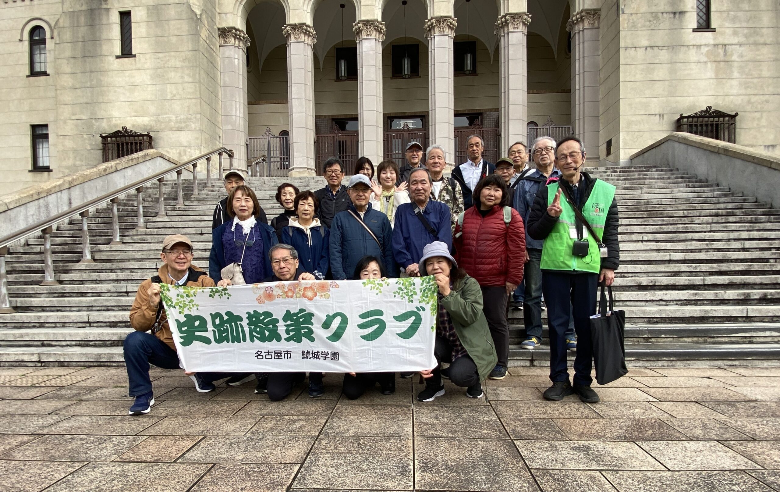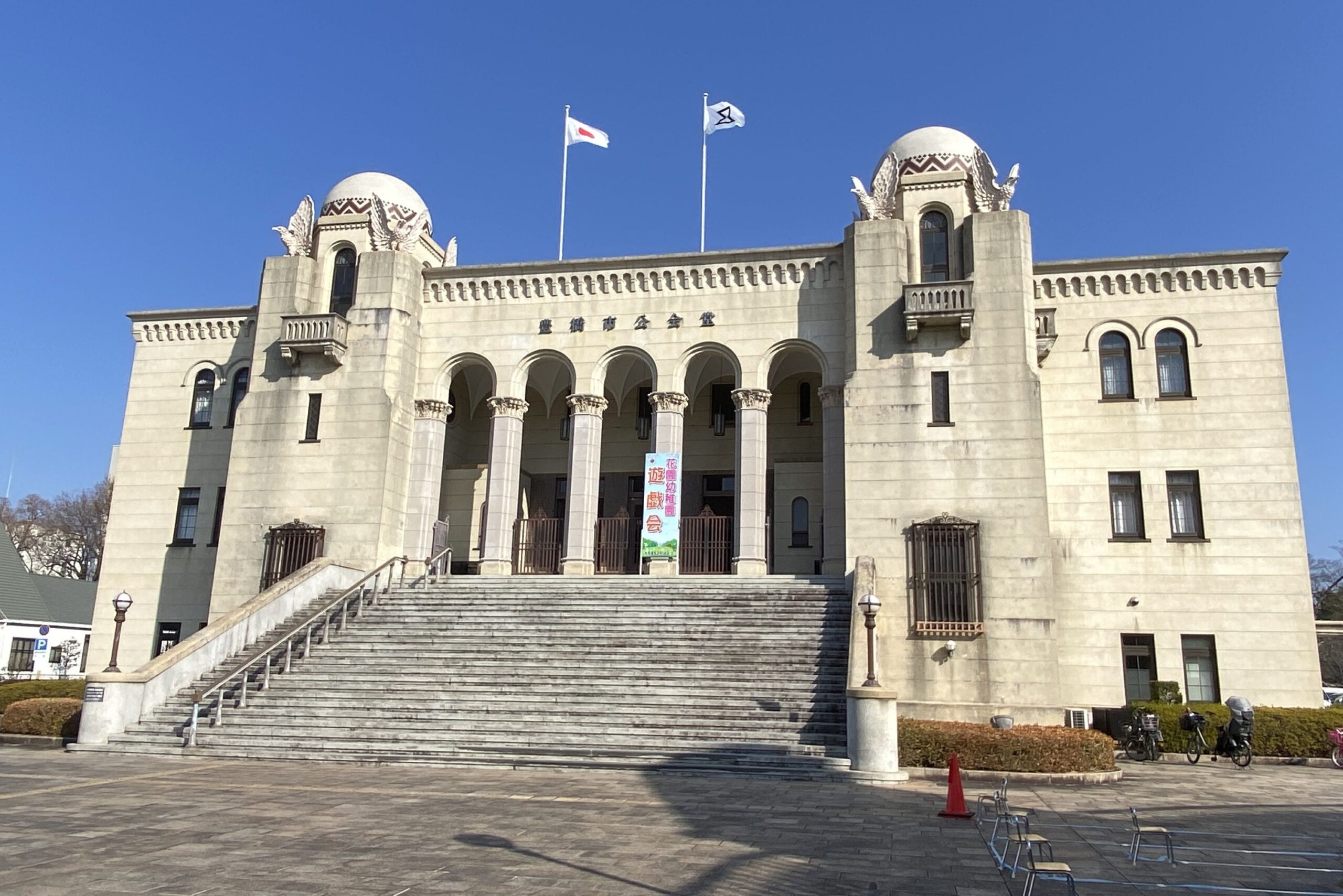 2月26日、20名で「吉田城と二川宿」を散策しました。皆さん早めに金山駅に集合していただいたため、予定より1本早い名鉄特急豊橋行きに乗車しました。豊橋駅から豊鉄市内線の路面電車に乗り換え、市役所前で下車。最初の目的地である「豊橋市公会堂」でボランティアガイドさんと会いました。「豊橋市公会堂」は、昭和天皇の即位を記念して、昭和6年(1931)に建てられ、半球ドームと鷲がシンボルのロマネスク様式の建物で、豊橋空襲で市街地の約90%が焼失する中、焼火を免れた数少ない建物だそうです。昭和11年の昭和天皇の旅行では公会堂に立ち寄り、貴賓室で休憩、今もその部屋は残っているそうです。