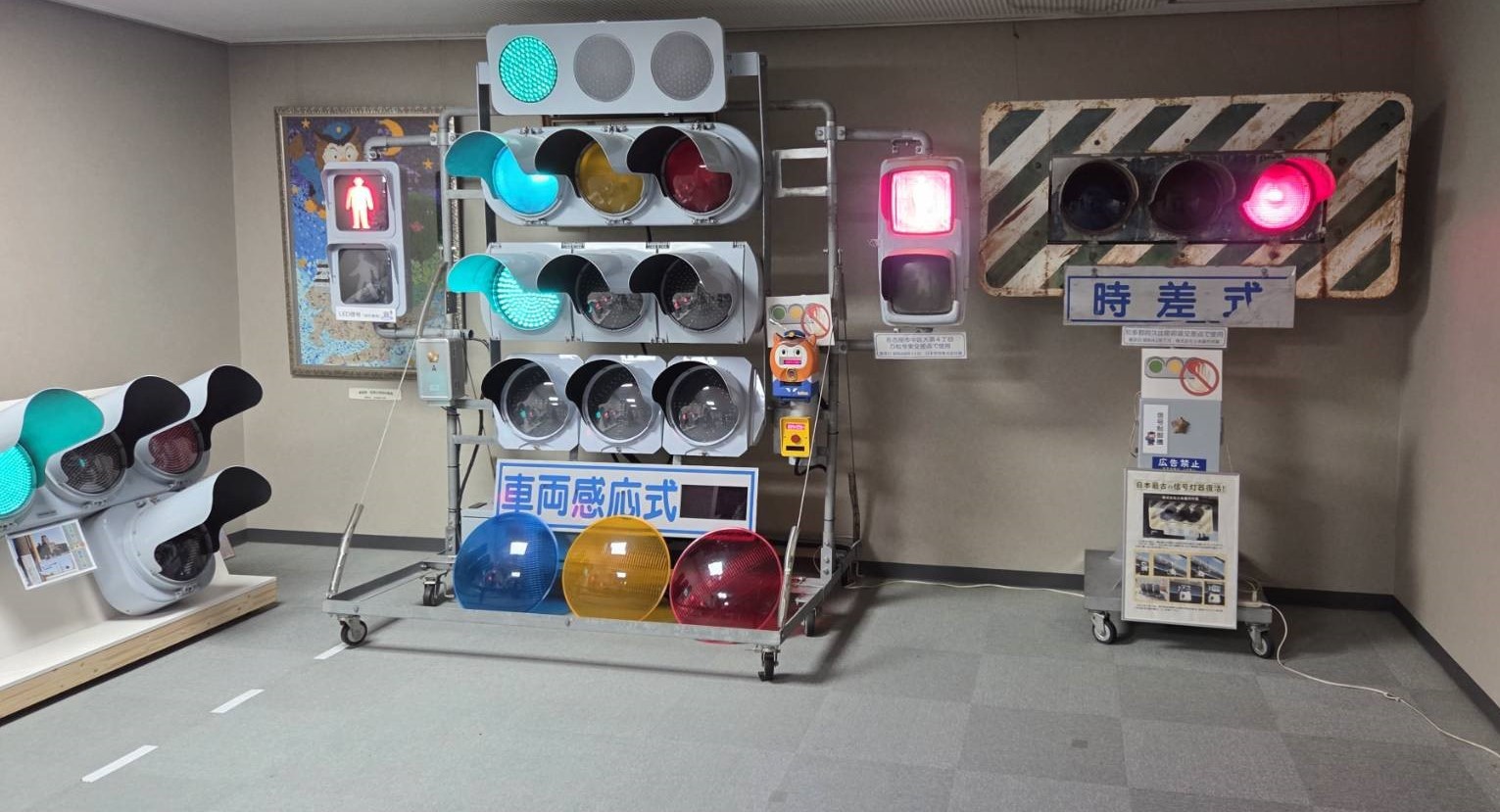 愛知県県警本部では県民の安全を守るための取り組み状況が見学出来ます。「通信指令室」では110番通報の受理・対処の様子、「交通管制センター」では県内主要道路の状況をリアルタイムで把握し指令指揮する様子などを、それぞれガラス越しに見学しながら説明を受けました。高速道路の渋滞表示入力や各テレビ局の交通情報(局ごとのブースがある)もここで実施しているとのことです。各種信号機の展示のみ写真撮影可能でした。LED信号機は愛知県警が世界初採用だそうです。
