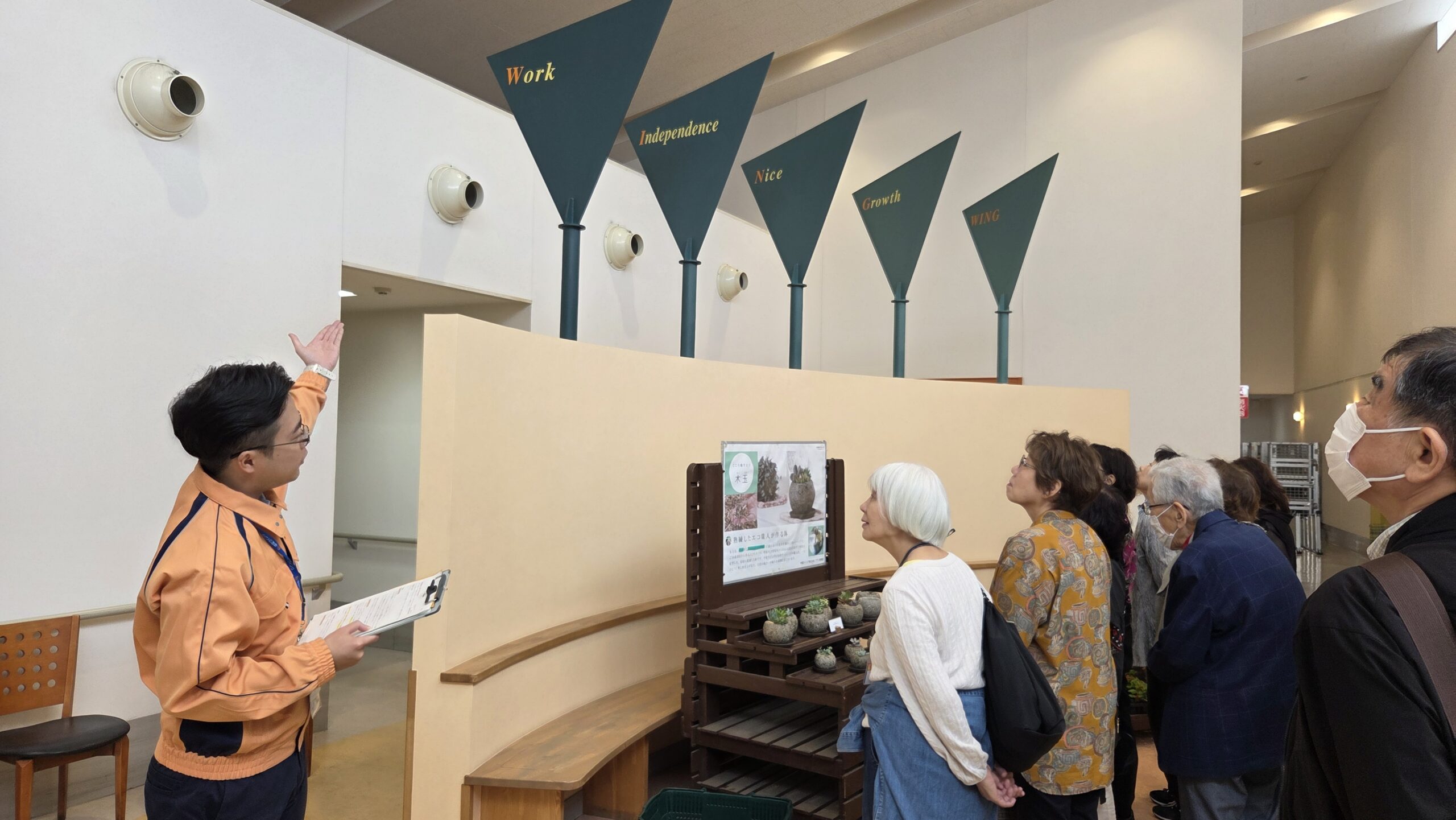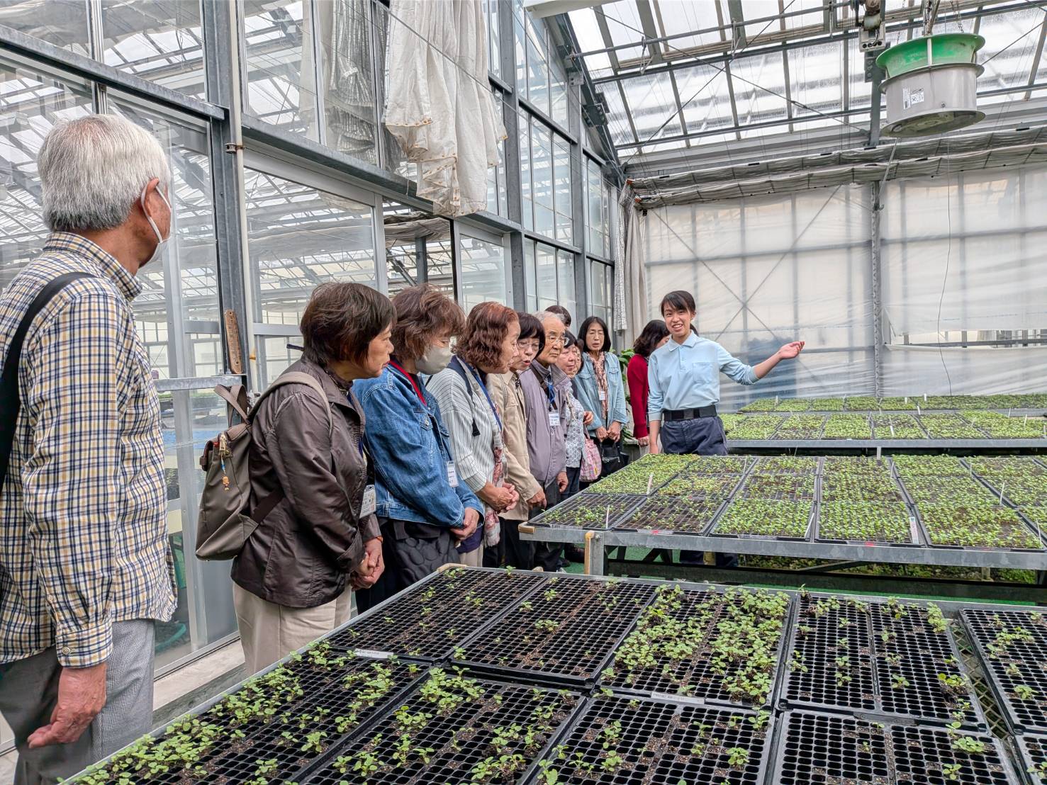 その後、3グループに分かれて、総務・デザイン課、人事課、営業センター(販売業務)、笠寺ハブセンター(商品の梱包・発送・印刷業務)、アグリファーム(種まきから花や苺の苗を育てる)の各部門を順に見学しました。各々の現場で働く障がいのある従業員の方が、事前に学習した内容を誠意を込めて説明してくれました。一生懸命説明される姿に集中・感動しながらの見学でした。また、各部署では、障がいをカバーする掲示物、音(放送受信)や電灯表示(パイロットランプ)、ユニバーサル設計に配慮した設備など働きやすい環境が整えられていることも見学できました。この会社は、見学した笠寺地区以外に、複数の支社があって運営されています。また、笠寺のアグリファーム部署で育てられた花苗は親会社の数多い社屋の花壇に植え育てられていること、また苺は岐阜県可児市に設置されたアグリファームで育てられ収穫・販売する作業が行われているとの説明を受けました。