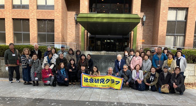 敷地内では写真撮影不可なため敷地外で集合写真撮影をして、国際空港並みの手荷物X線検査と金属探知ゲートを全員がくぐりようやく入場。まず全員で名古屋地裁最大の2号法廷(96席)の傍聴席に座って裁判制度や裁判所の説明を受けました(詳細後述)。その後、2号法廷内を自由見学。裁判長席や被告席などに座ることや、その写真も一定の制約の下で許可されて撮影できました。ただしこのホームページへの掲載は不可とのことで、残念ながらお見せできません。その後は、班ごとに分かれて実際に開廷されている裁判を自由に傍聴。その時間帯では、違法薬物所持、無免許運転事故、コンビニでの万引き等の裁判を興味深く傍聴できました。