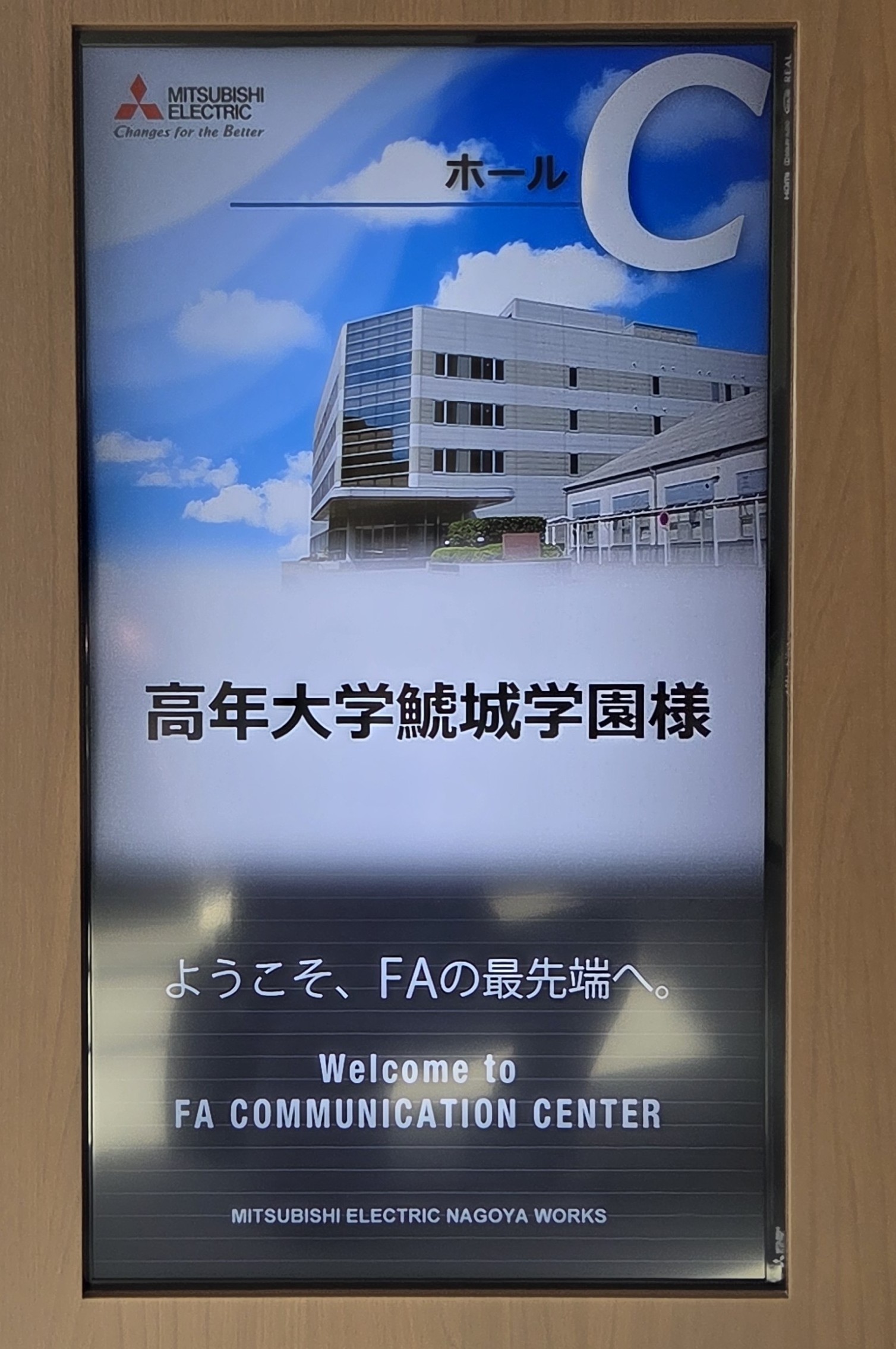 三菱電機のFA(ファクトリ・オートメーション)システム事業の中核拠点である名古屋製作所・産業メカトロニクス製作所を訪問しました。まず全員で概要説明を受けた後、2グループに分けて「FAコミュニケーションセンター」と「生産棟」を見学しました。