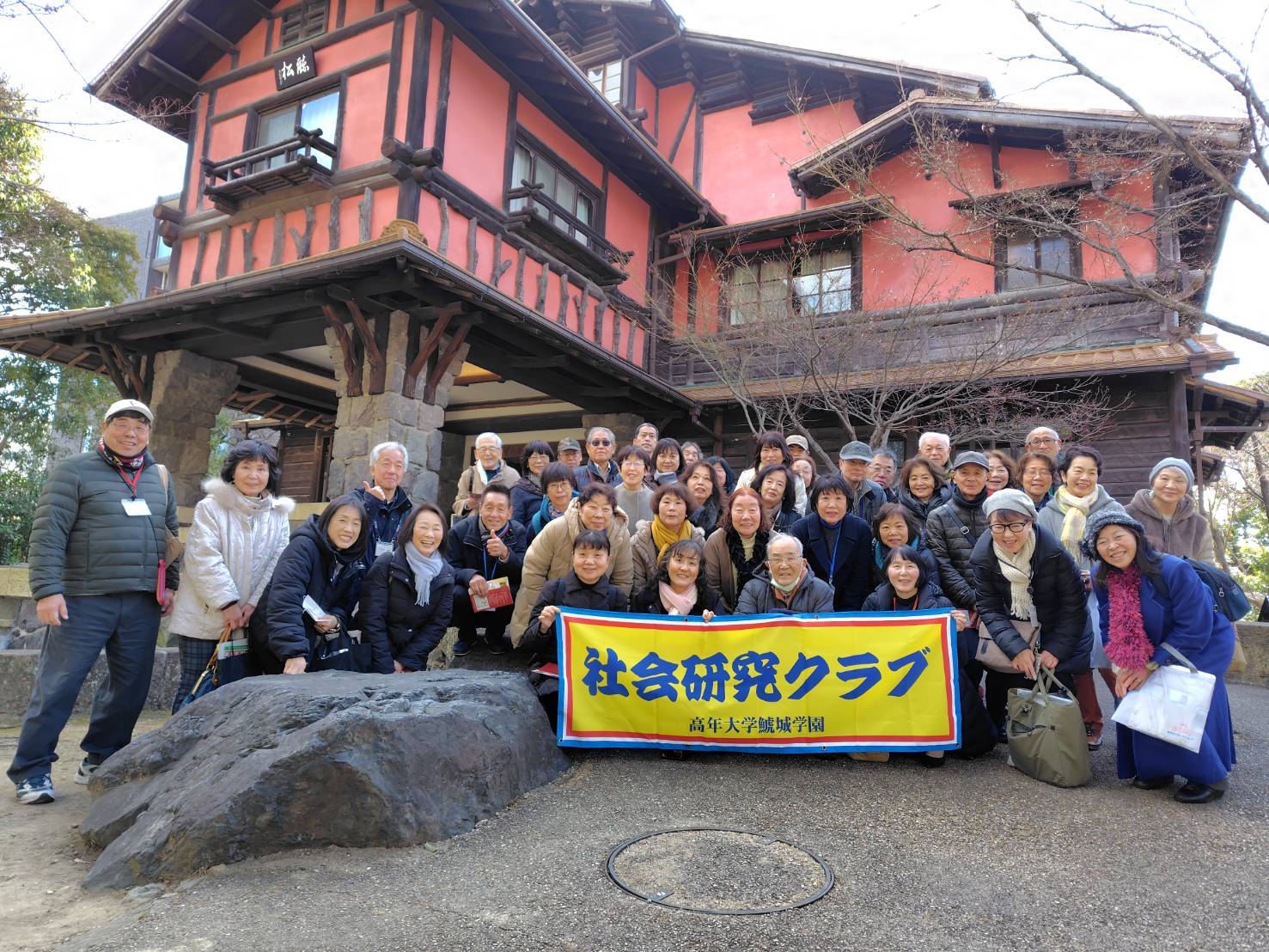 揚輝荘は、大正から昭和初期にかけて活躍した松坂屋初代社長・伊藤次郎左衞門祐民の別荘として造営された建物で、和館・洋館、そして回遊式庭園から構成されています。東山の自然を生かした広大な敷地には、当時の建築技術や美意識が随所に感じられ、名古屋の近代化の歩みを今に伝える貴重な文化財です。 42名の参加者を2つのグループに分け、各グループ約1時間30分、ガイドの方から詳しい説明を受けました。