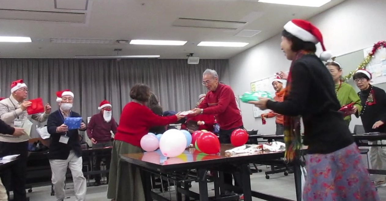 ジェスチャーゲームの後はプレゼント交換をしました。まず自分が持って来たプレゼントを目の前に置き、リサが話す物語の中でrightと言われたら右隣、leftと言われたら左隣の人に渡します(写真1)。プレゼントが数回行ったり来たりして運ばれた時、リサがacrossと言い、真ん中のテーブルを隔てた、反対側に座っている人に渡せとの指示。あわてて皆が反対側に向かい、プレゼントを交換しました(写真2)。その後、短いクリスマスソングを3曲歌い、最後は少しダンスも加えて、温かな雰囲気でパーティーを終えました。