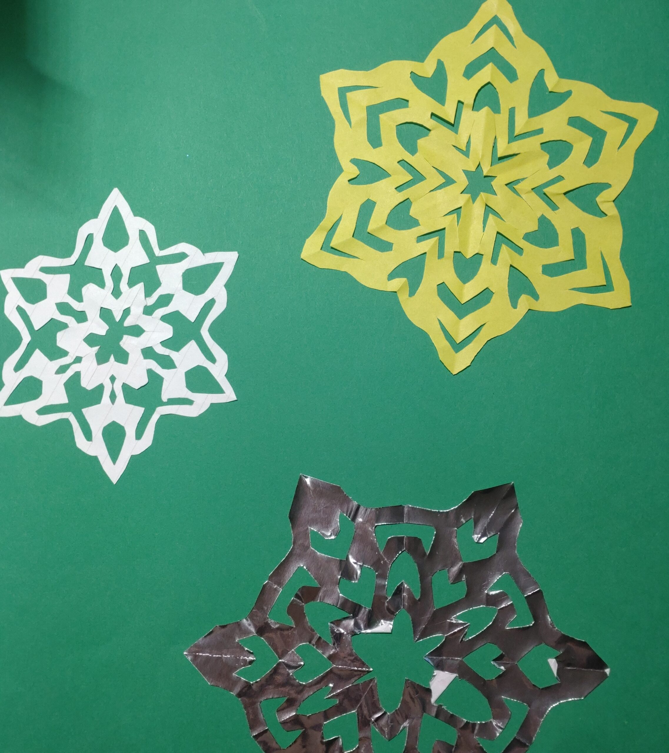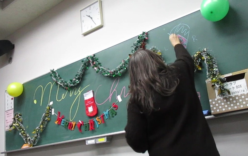 2学期最後のレッスンは、例年クリスマスパーティーですが、今年は まずcraft(工作)をしました。紙を切ってsnow flake(雪の結晶)(写真1)を作りました。紙をどう折るか、折った後どこに切り込みを入れるかリサが黒板に描いて説明しました(写真2)。 その後は、ジェスチャーゲームをしました。2班に分かれて、リサの指示したクリスマスにちなんだものを各班1人ずつが班のメンバーに動作で伝え、早く答えた方が勝ちです。写真3は 2人がSanta Clause のジェスチャーをしているところです。