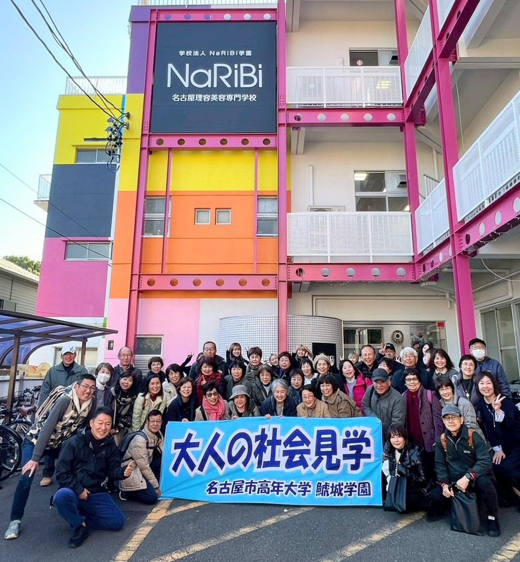 2025年度第五回学外活動「名古屋理容美容専門学校」見学に38名参加しました。同校は求められるサービスの多様化に伴い「理容師」「美容師」両方の資格取得を目指し男性に限らず、女性のニーズにも応えられる幅広い人材育成を行っています。大人の社会見学クラブとしては理容・美容関係先見学が 初めての機会となり参加者皆さんも興味深々で臨まれました。