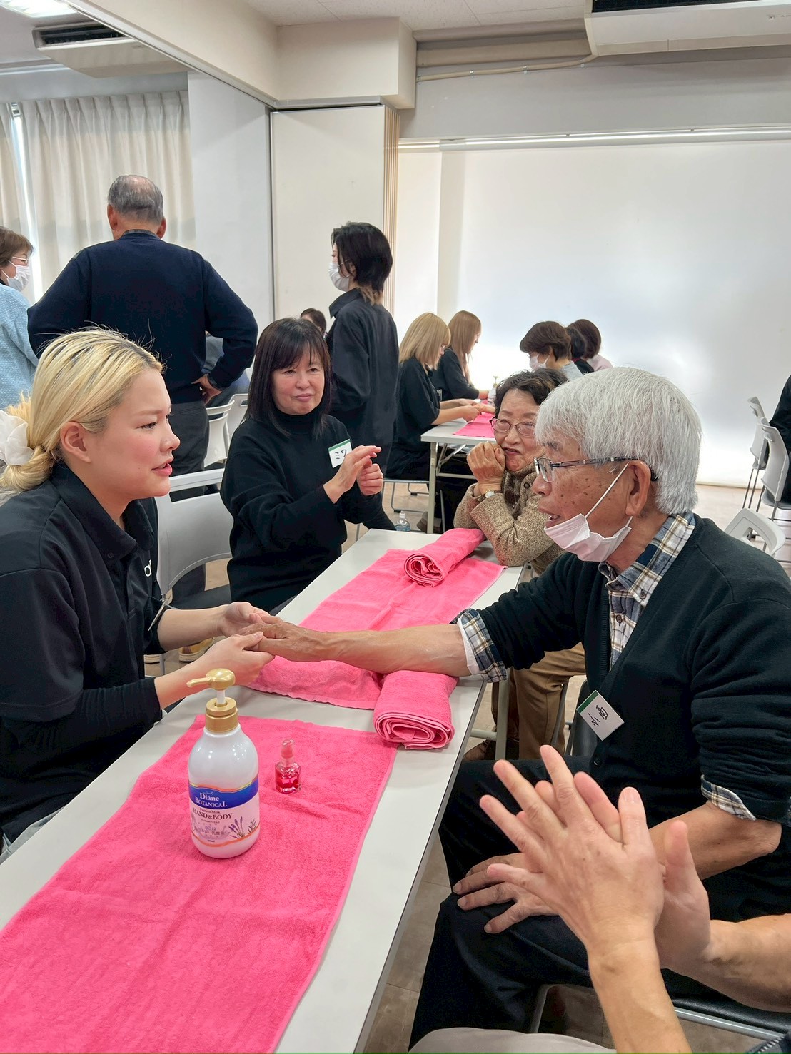 ネイル検定に挑戦した後は、スタッフの方々から全員にハンドマッサージとボディジュエリー(ボディタトゥーシール:ファッションとして一時的な装飾シール)を施術して頂きました。男性もにこにこしながら楽しそうでしたね!