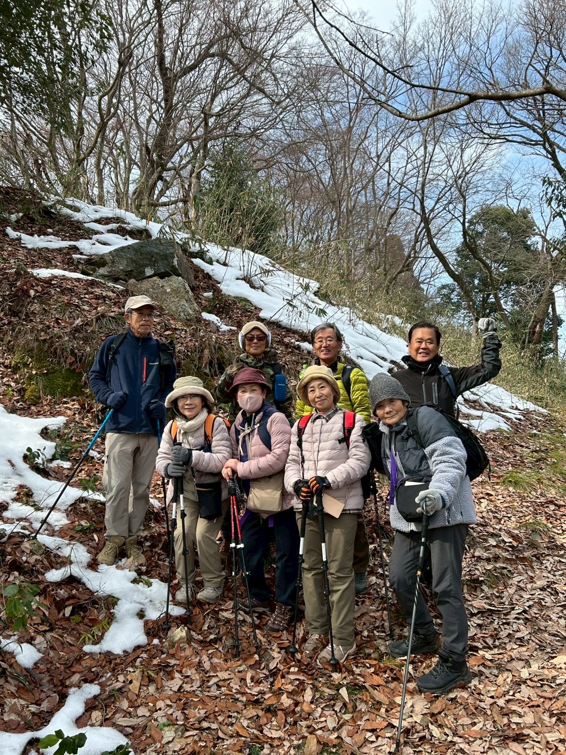 山中で急な斜面が現れると、その昔侍が登城するのに苦労してこの坂道を登ったはずだと話が弾みました。そして、やがて山頂へ到着、城趾らしく山頂は平らで広い地形でした。山頂からやや下がったところには、石垣の跡や井戸が残り、当時を忍ばせていました。山頂からは大展望を楽しめました。春のような陽気の中で弁当を食べた後下山にかかりました、歴史が楽しめた素晴らしい一日でした。