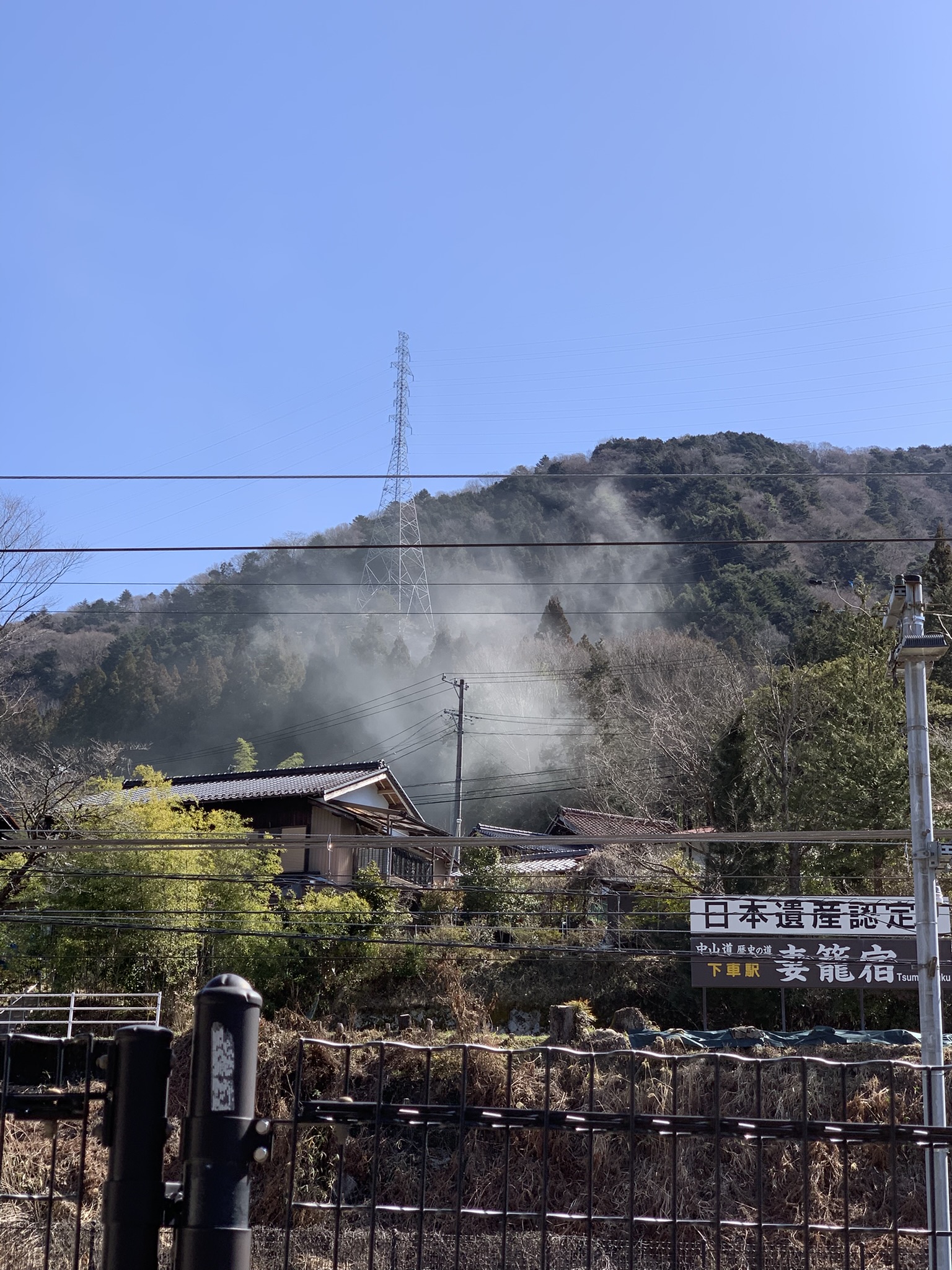 今日の一枚:すわ山火事か? 木曽路は山の中、ピッタリ杉花粉の季節、さすが木曽路の花粉の飛散は巨大で恐ろしい。