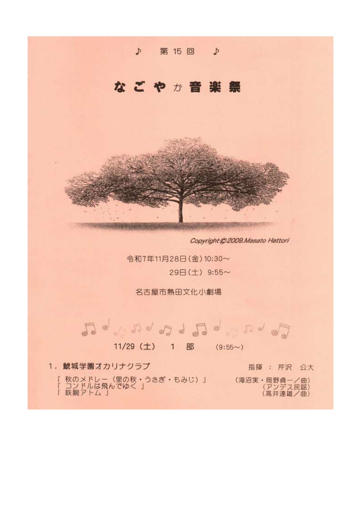 秋も深まった11月28~29日、熱田文化小劇場において「第15回なごやか音楽祭」が開催されました。これは2日間で合計48団体の出演による音楽祭で、我がオカリナクラブは、29日(土)にステージに上がりました。