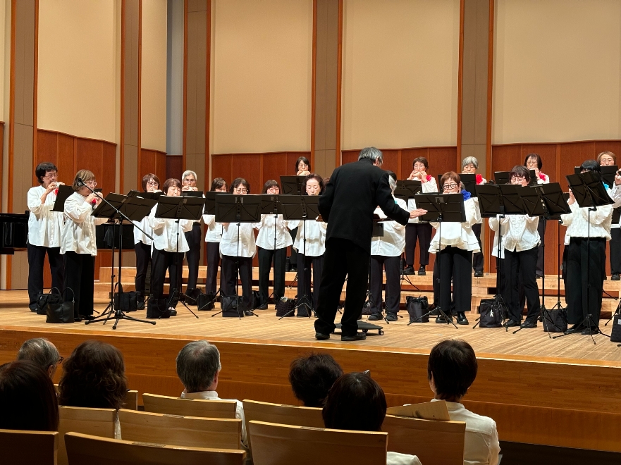先日の文化祭と同じ曲目を披露しましたが、また違った緊張感で臨んだステージでした。でも一生懸命気持ちを込めて演奏しました。芹沢講師の指揮棒に合わせてピタッと決まった曲の終わり、講師の笑顔とうなずきで我々も少しは成長したなと実感しました。優しい音色、心に沁みる音色に皆さんもぜひ触れてみてください。