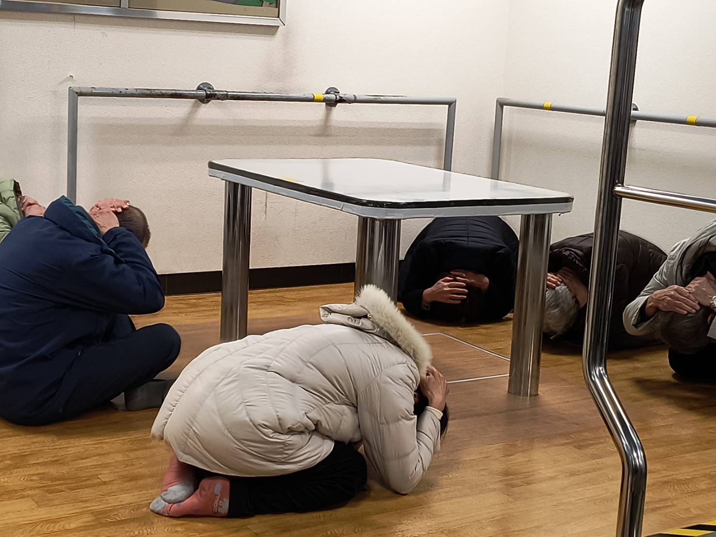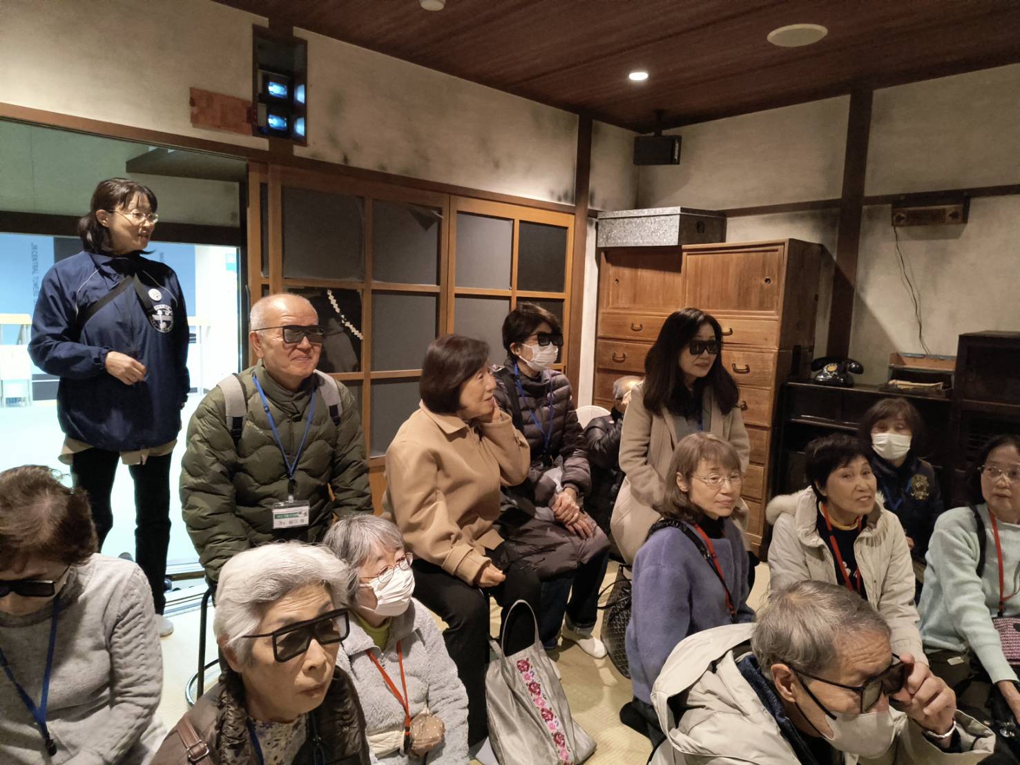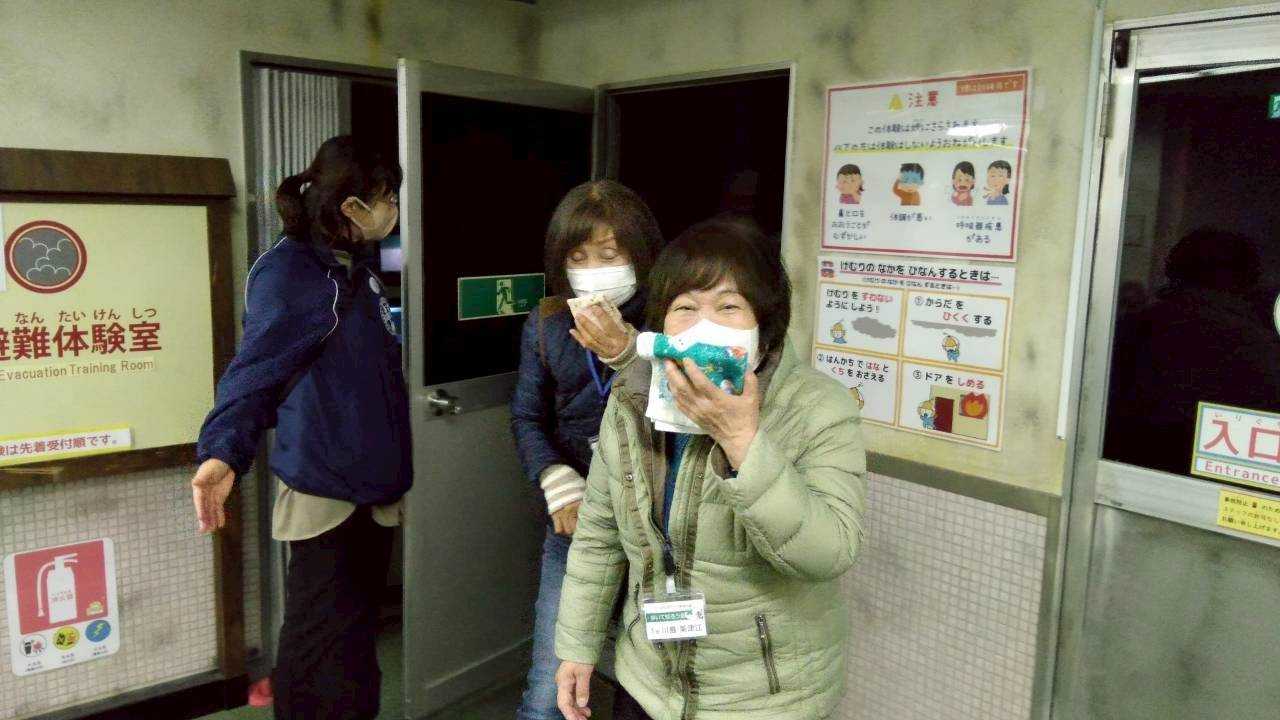 センターでの疑似体験 ① 地震体験室にて、震度7クラスの揺れを体験しました。 縦揺れ、横揺れとものすごい大きな揺れで、両手で頭の後ろをかばい、ダンゴムシのポーズをとるのが良い対処だと学びました。 ② 3Ðシアター室で伊勢湾台風の恐ろしさを体験しました。特に大木が、流れてきた時、悲鳴があちらこちらから聞こえました。また台風に備えて、情報収集、避難時の備蓄品の重要性をあらためて感じました。 ③ 煙避難体験室にて火災時の煙の中で、煙の特性、的確な避難姿勢や避難方法を学びました。