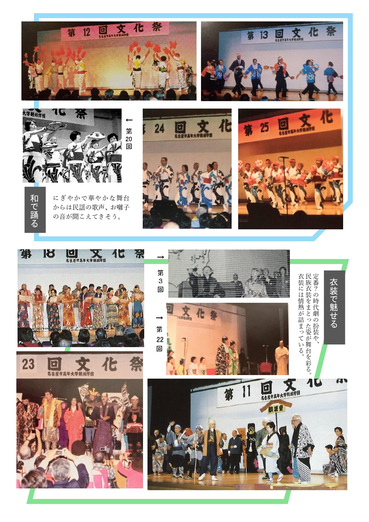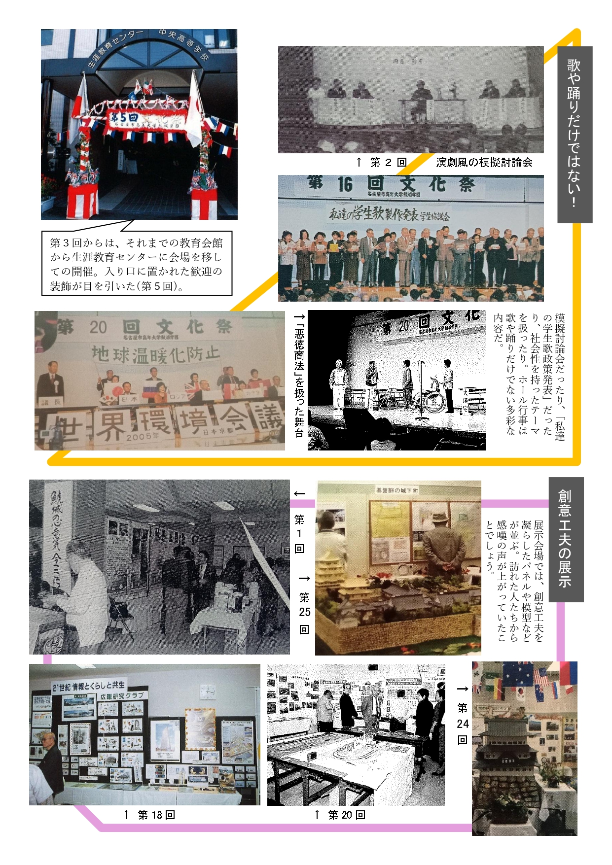 11月6日(木)から、いよいよ文化祭。今年は節目の第40回です。鯱城学園の周年史や鯱城誌などに掲載された1986(昭和61)年の第1回から第30回までの写真の中から何枚かを拾い集めてアルバムをつくりました。 「やっぱり40年の歳月を感じるな」「月日が経ってもやってることは変わっていないね」。思いそれぞれに、みなさんが鯱城学園文化祭の歴史に触れていただければと思います。